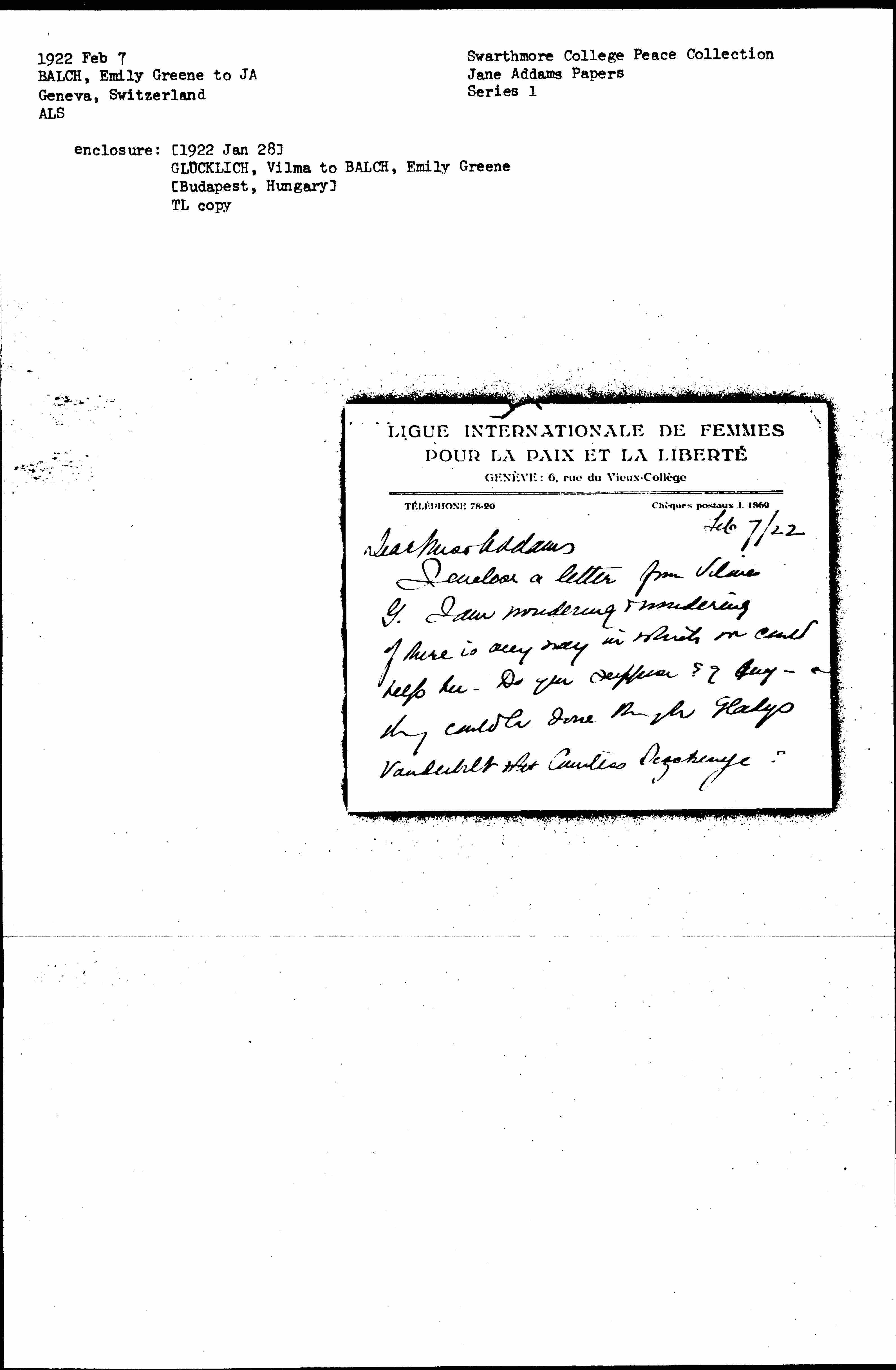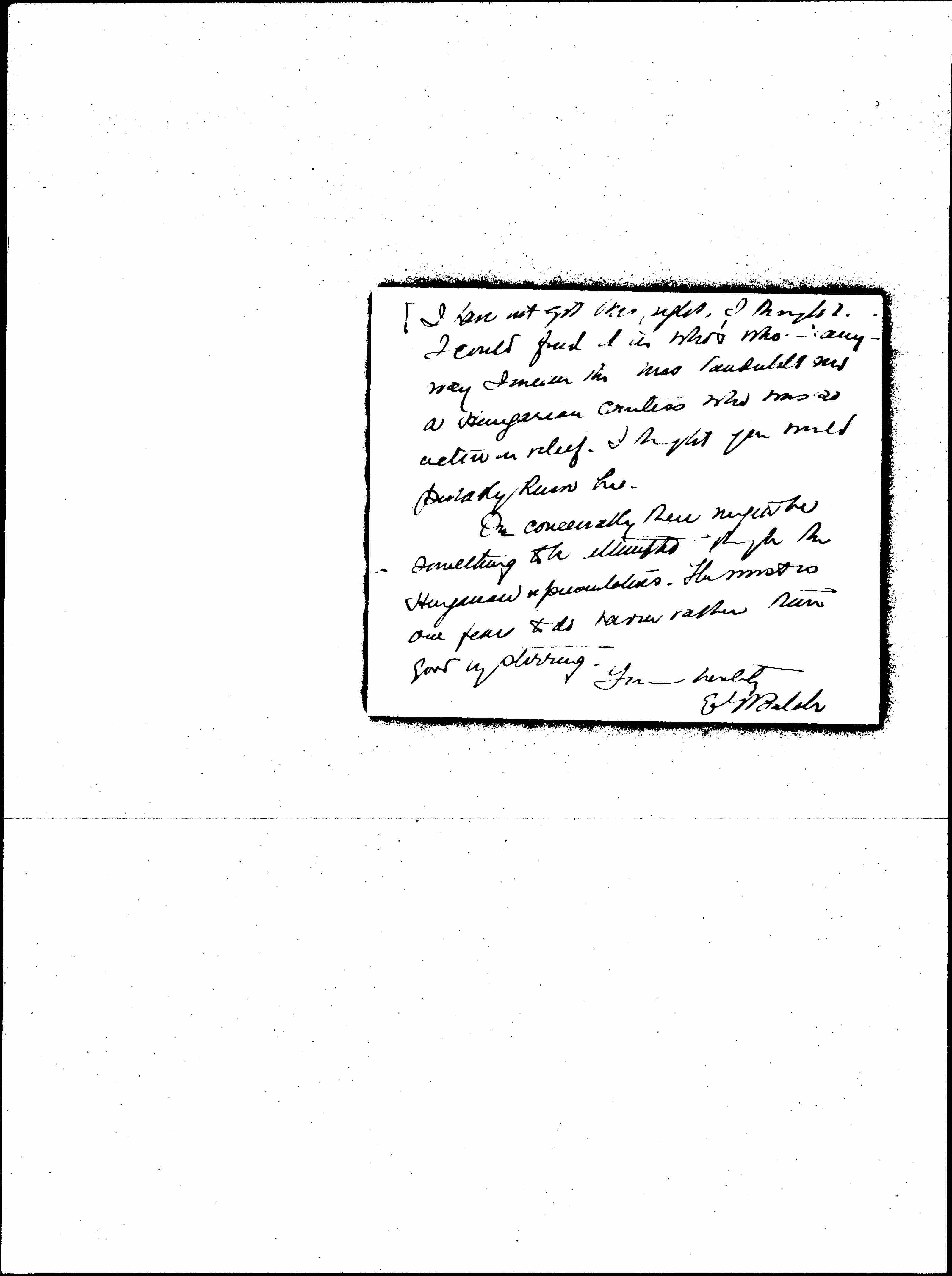 I enclose a letter from Vilma G. I am wondering & wondering if there is any way in which we could help her. Do you suppose [illegible] anything could be done through Gladys Vanderbilt [illegible] Countess [Széchenyi]? [page 2]