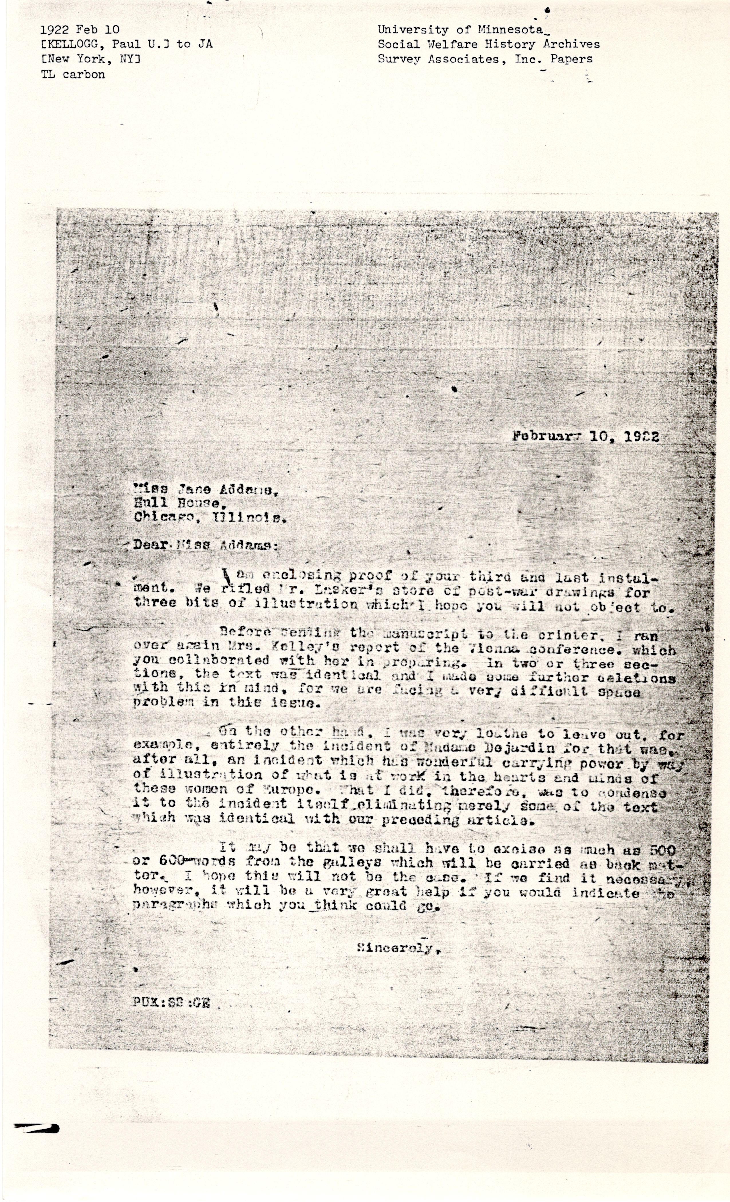 Before sending the manuscript to the printer, I ran over again Mrs. Kelley's report of the Vienna conference, which you collaborated with her in preparing. In two or three sections, the text was identical and I made some further deletions with this in mind, for we are facing a very difficult space problem in this issue.