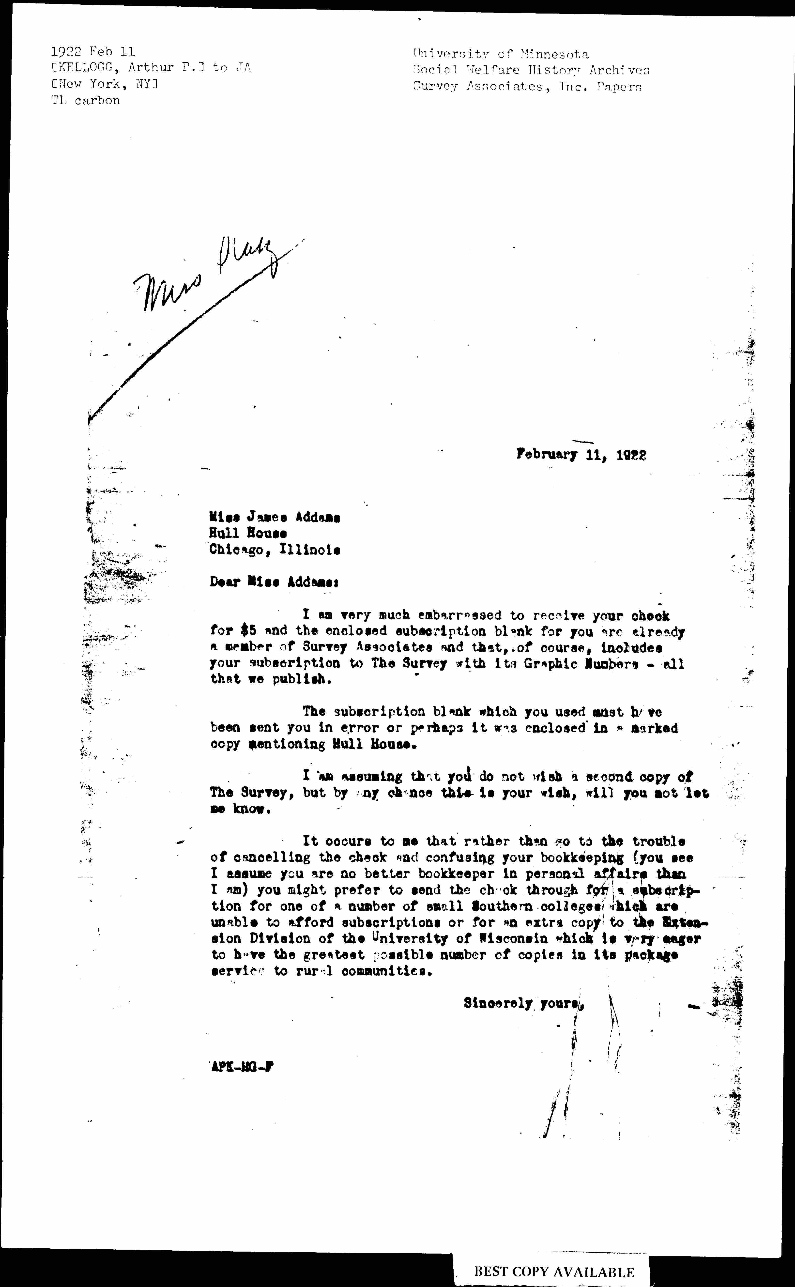 It occurs to me that rather than go to the trouble of cancelling the check and confusing your bookkeeping (you see I assume you are no better bookkeeper in personal affairs than I am) you might prefer to send the check through for a subscription for one of a number of small Southern colleges which are unable to afford subscriptions or for an extra copy to the Extension Division of the University of Wisconsin which is very eager to have the greatest possible number of copies in its package service to rural communities.