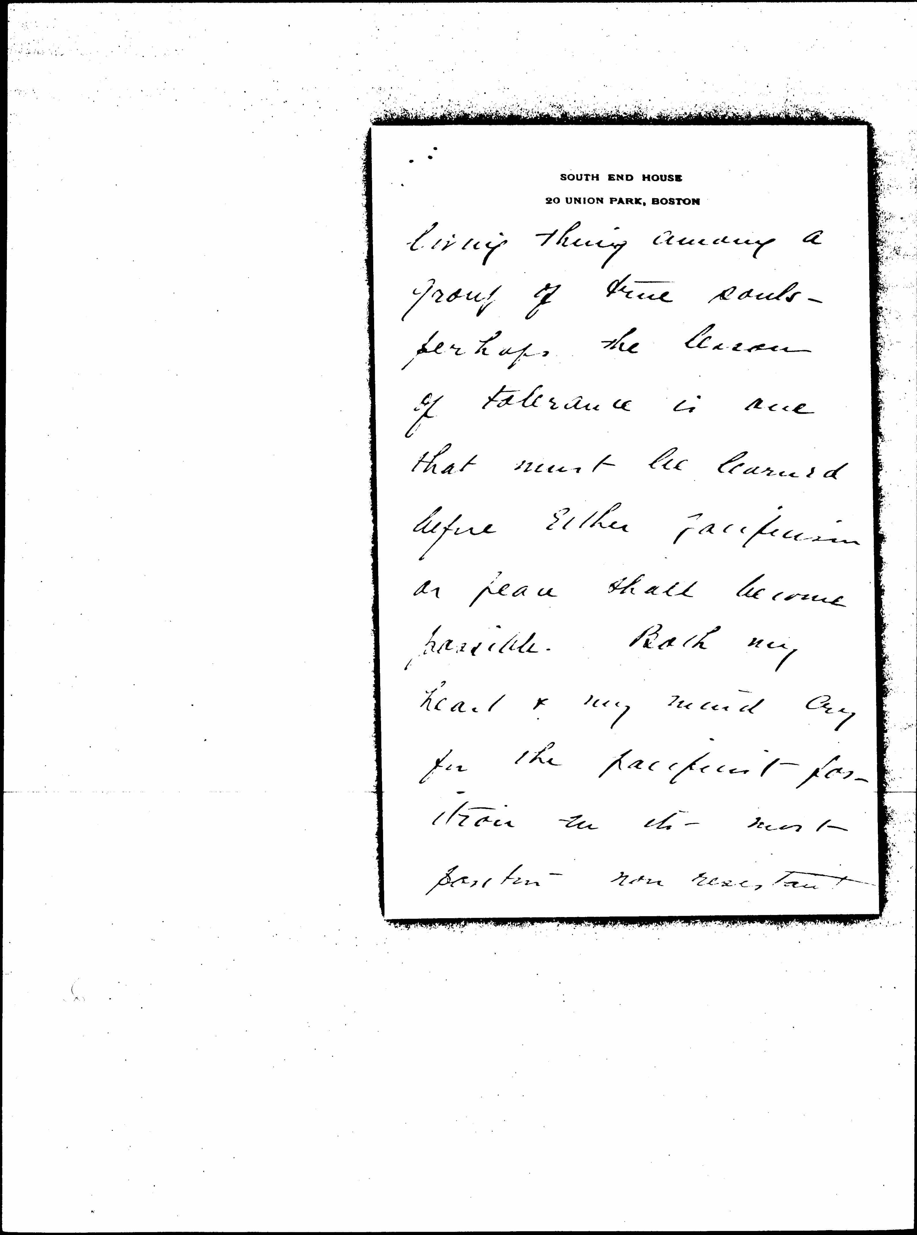 We hope much from your book -- it will interpret and so do a great deal in the necessary work of reconciliation. It is a great thing to bring people to see that a great ideal is a [page 3] living thing among a group of true souls -- perhaps the lesson of tolerance is one that must be learned before either pacifism or peace shall become possible. Both my heart & my mind cry for the pacifist position in its most positive [non-resistant] [page 4] form. Along with it however is a horrid instinct to act & with force. This dualism is I imagine common enough among the run of men. Interpretation of the [mind] you better than any one else can do helps us greatly.