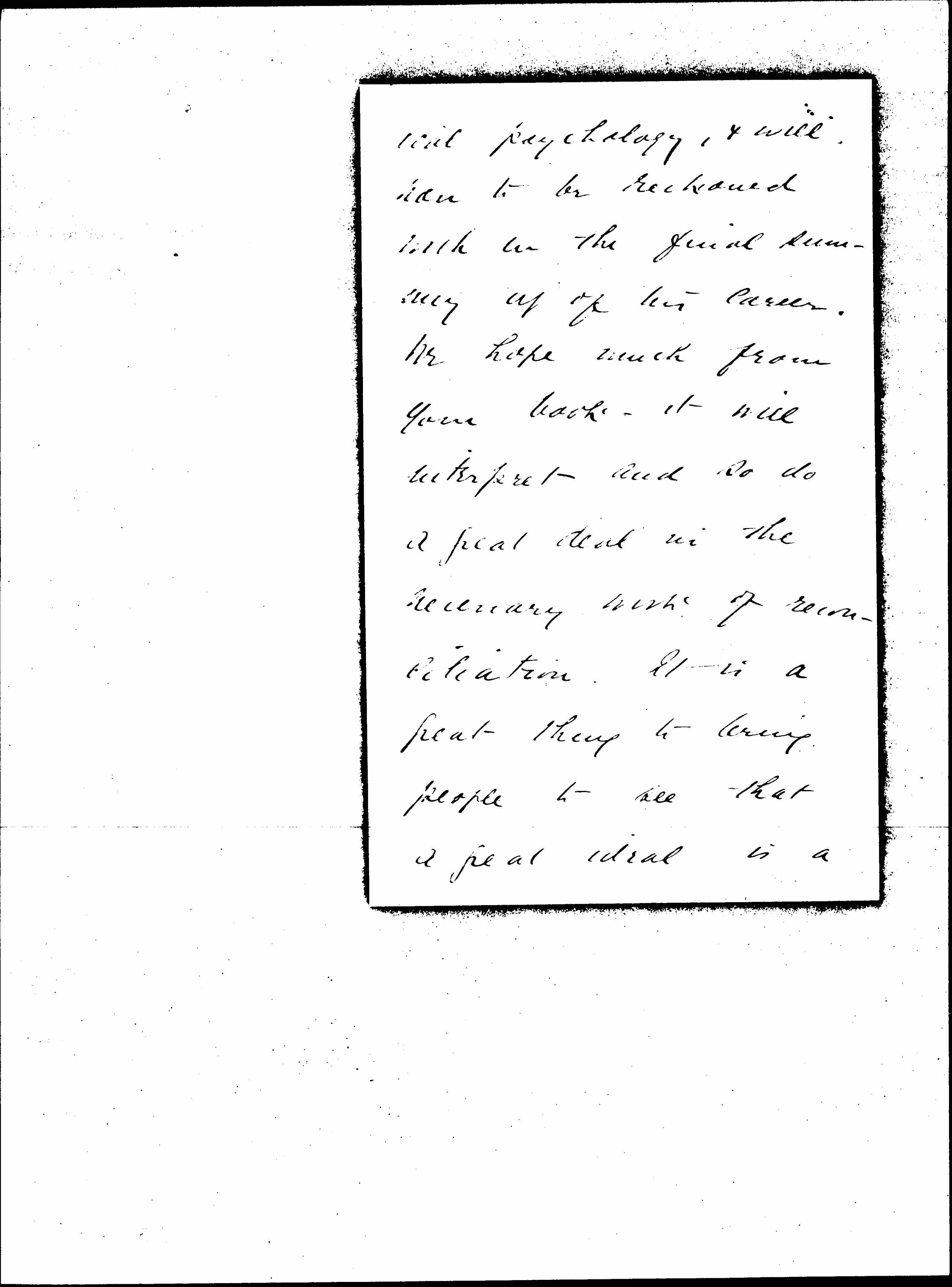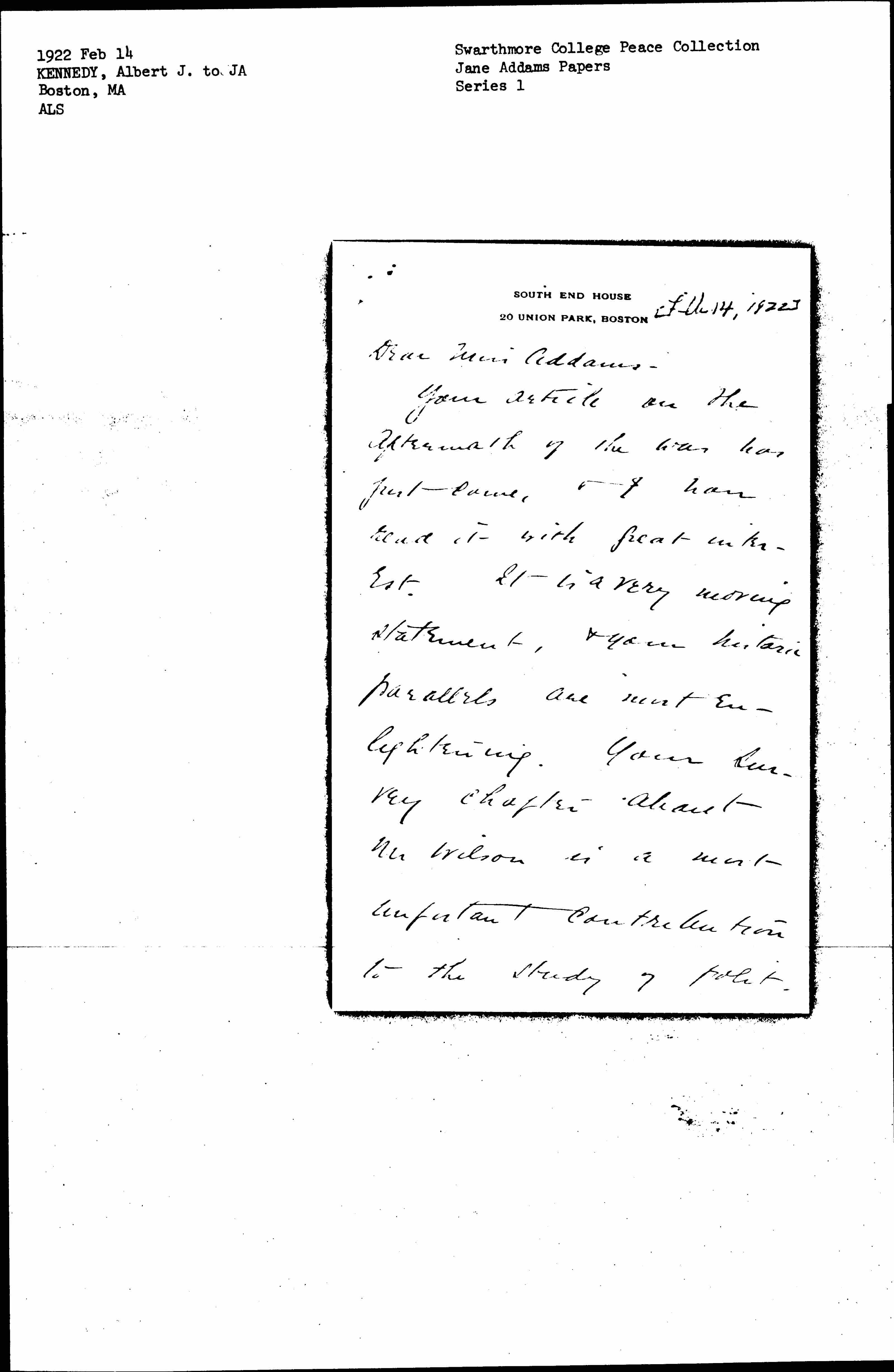 Your article on the aftermath of the war has just come, & I have read it with great interest. It is a very moving statement, & your historic parallels are most enlightening. Your Survey chapter about Mr Wilson is a most important contribution to the study of political [page 2] psychology, & will have to be reckoned with in the final summing up of his career.