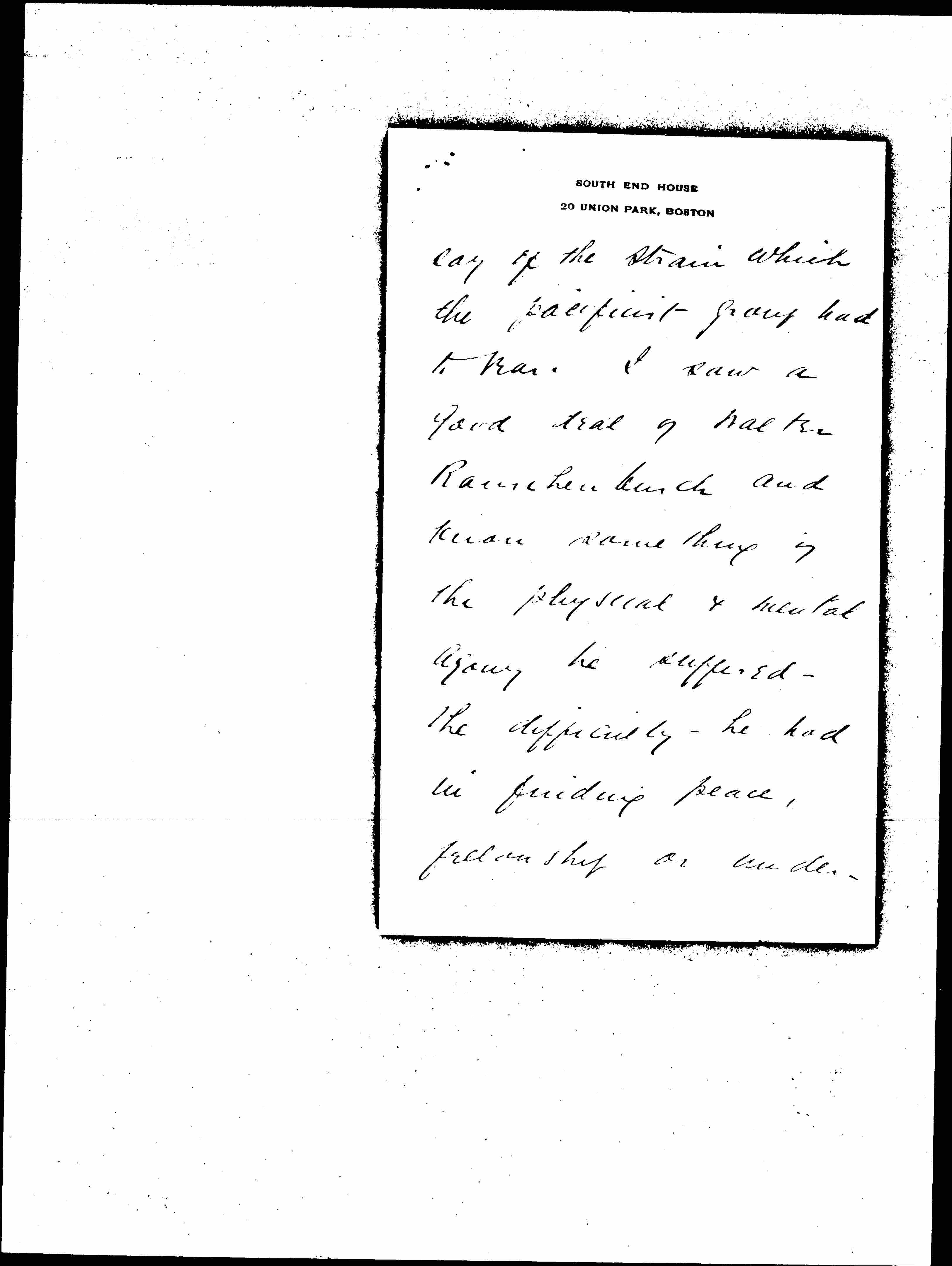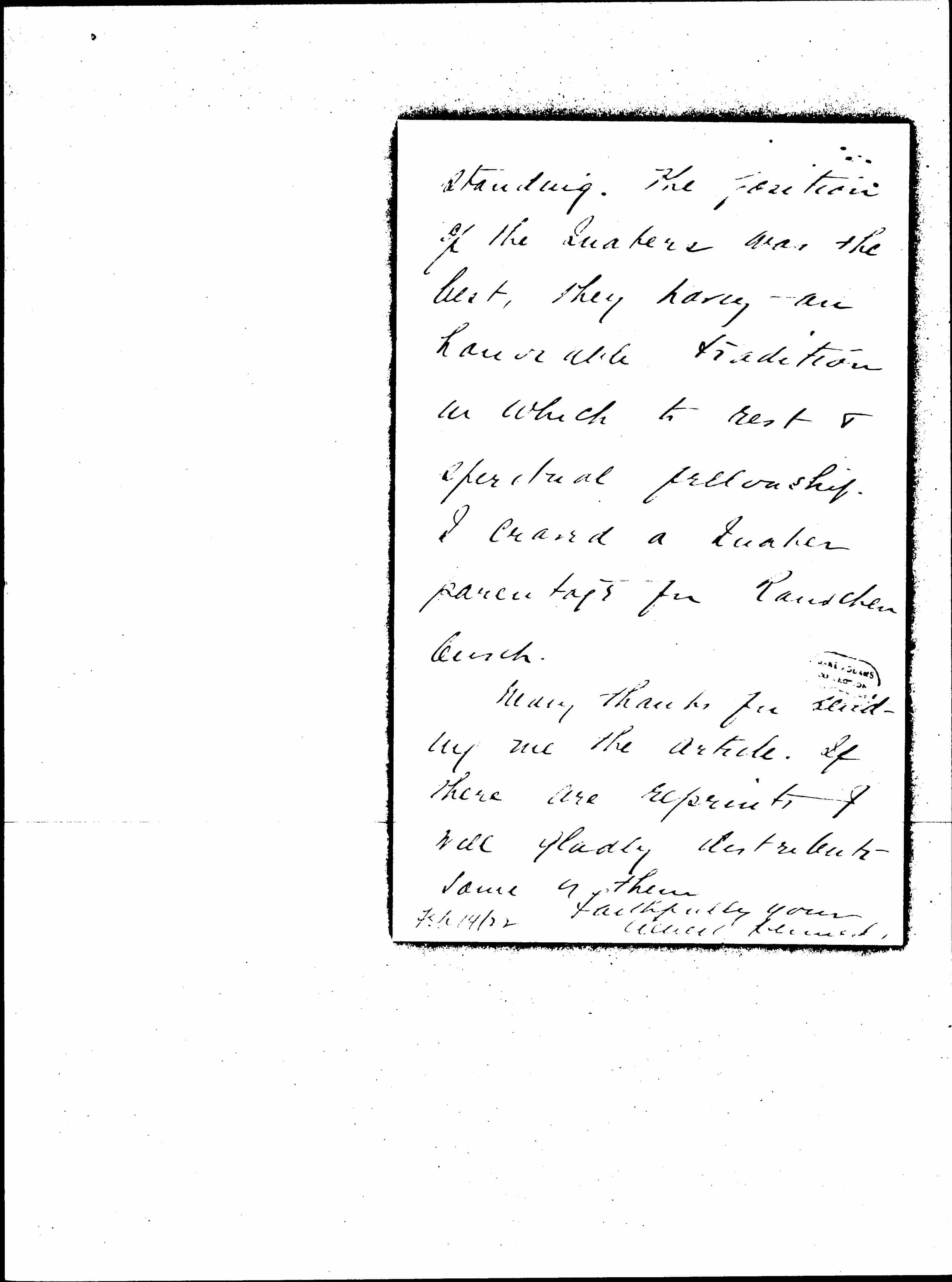I am much impressed by what you [page 5] say of the strain which the pacifist group had to bear. I saw a good deal of Walter Rauschenbusch and know some thing of the physical & mental agony he suffered -- the difficulty he had in finding peace, fellowship or understanding. [page 6] The position of the Quakers was the best, they having an honorable tradition on which to rest & spiritual fellowship. I craved a Quaker parentage for Rauschenbusch.