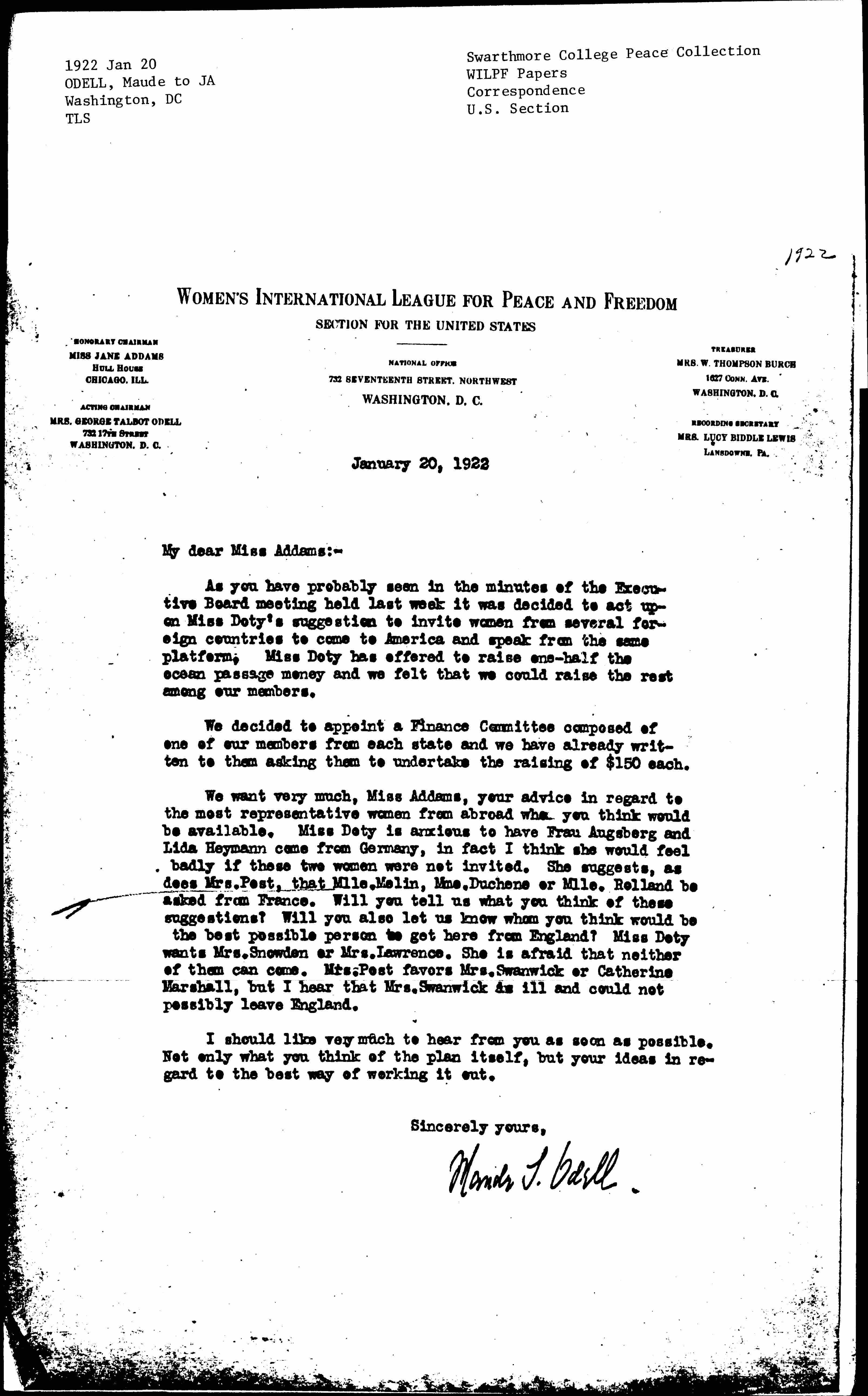 We want very much, Miss Addams, your advice in regard to the most representative women from abroad who you think would be available. Miss Doty is anxious to have Frau Augsberg and Lida Heymann come from Germany, in fact I think she would feel badly if these two women were not invited. She suggests, as does Mrs. Post, that Mlle. Melin, Mme. Duchene or Mlle. Rolland be asked from France. Will you tell us what you think of these suggestions? Will you also let us know whom you think of would be the best possible person to get here from England? Miss Doty wants Mrs. Snowden or Mrs. Lawrence. She is afraid that neither of them can come. Mrs. Post favors Mrs. Swanwick or Catherine Marshall, but I hear that Mrs. Swanwick is ill and could not possibly leave England.