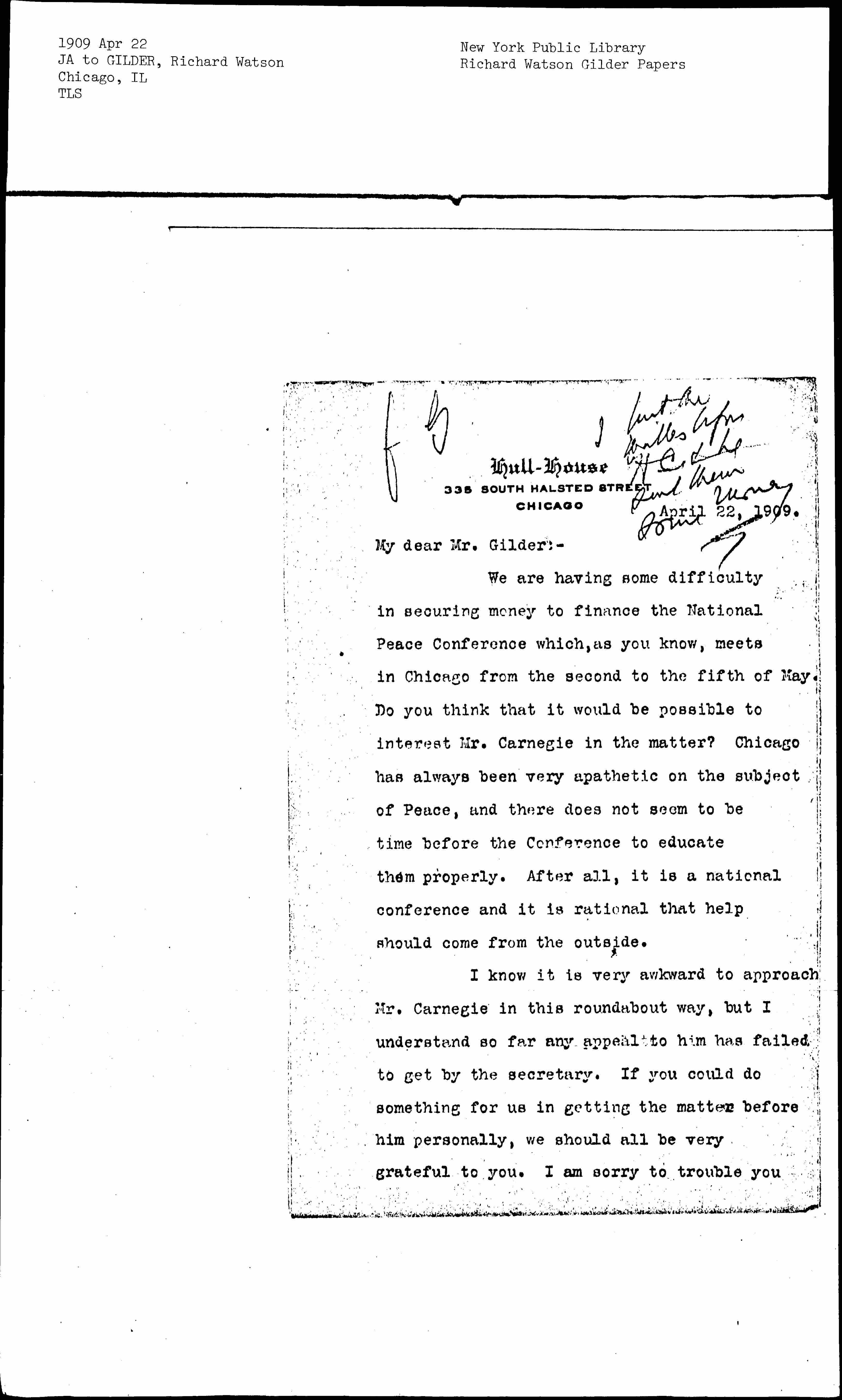 We are having some difficulty in securing money to finance the National Peace Conference which, as you know, meets in Chicago from the second to the fifth of May. Do you think that it would be possible to interest Mr. Carnegie in the matter? Chicago has always been very apathetic on the subject of Peace, and there does not seem to be time before the Conference to educate them properly. After all, it is a national conference and it is rational that help should come from the outside.