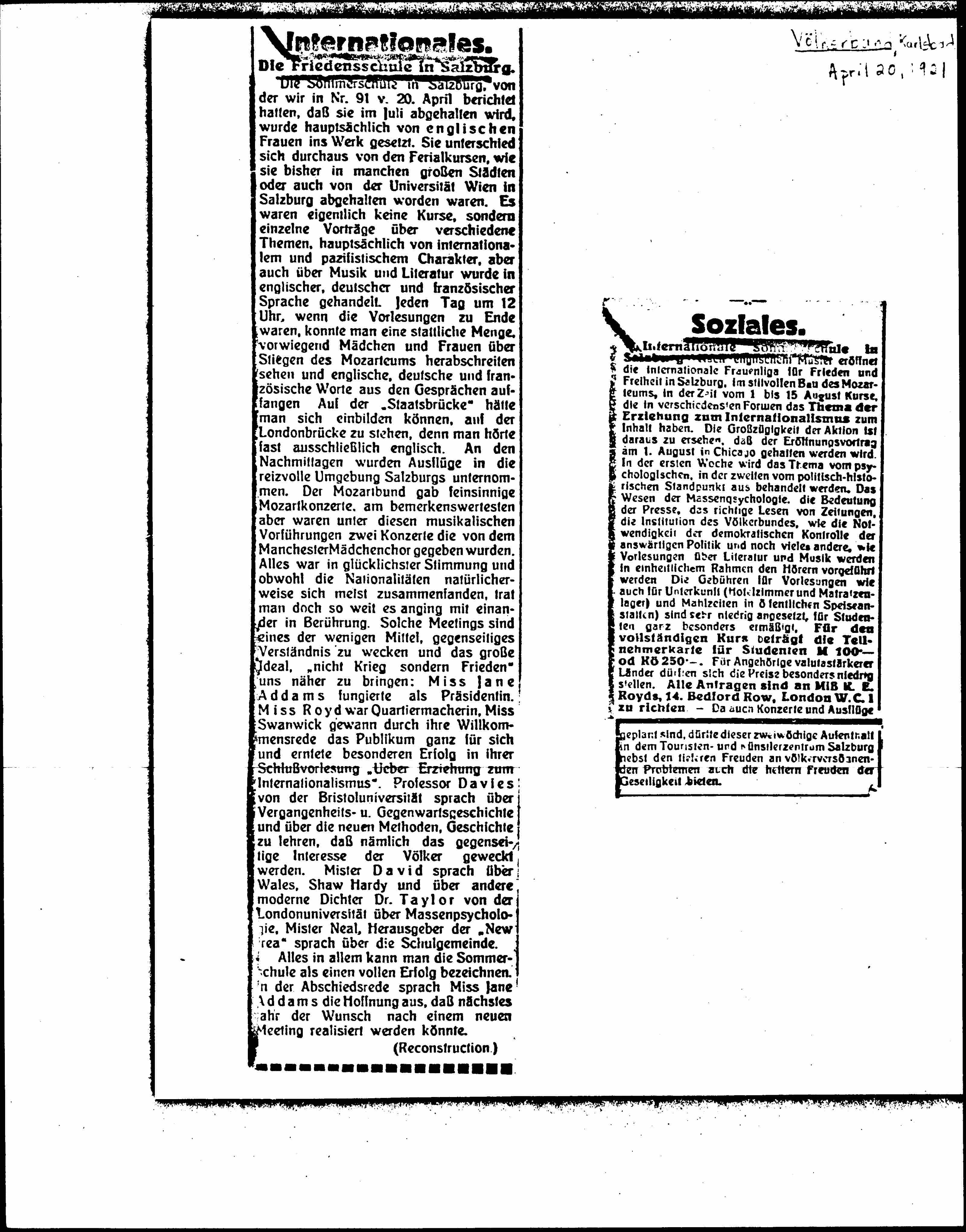 International summer school in Salzburg [illegible word] with an English [model?] is opened by the International Women’s League for Peace and Freedom in Salzburg, in the stylish building of the Mozarteum, in the period from 1 to 15 August, courses that deal with the subject of education for internationalism in various forms. The spaciousness of the campaign can be seen on the opening lecture that will be held in Chicago on August 1st. In the first week the topic will be discussed from psychological point of view and it the second from political-historical point of view. The nature of crowd psychology, the importance of the press, the right newspaper reading, the League of Nations institution, the need for democratic control of local politics and many other things, such as lectures about literature and music will be presented to the listeners in a uniform manner. The fees for the lectures as well as for accommodation (hotel room and matratzenlager) and meals in the public dining station) are set very low, especially reduced for students. For the entire course the subscription card is [M 100 or Kö 250?]. For members of countries with stronger currencies, prices may be especially low. All inquiries should be directed to Miss K. E. Royds, 14th Bedford Row, London W.C.I. Since concerts and trips are also planned, this two-week stay in the tourist and artist center of Salzburg should not only offer the profound delight of international reconciliation problems but also the cheerful joy of socializing.