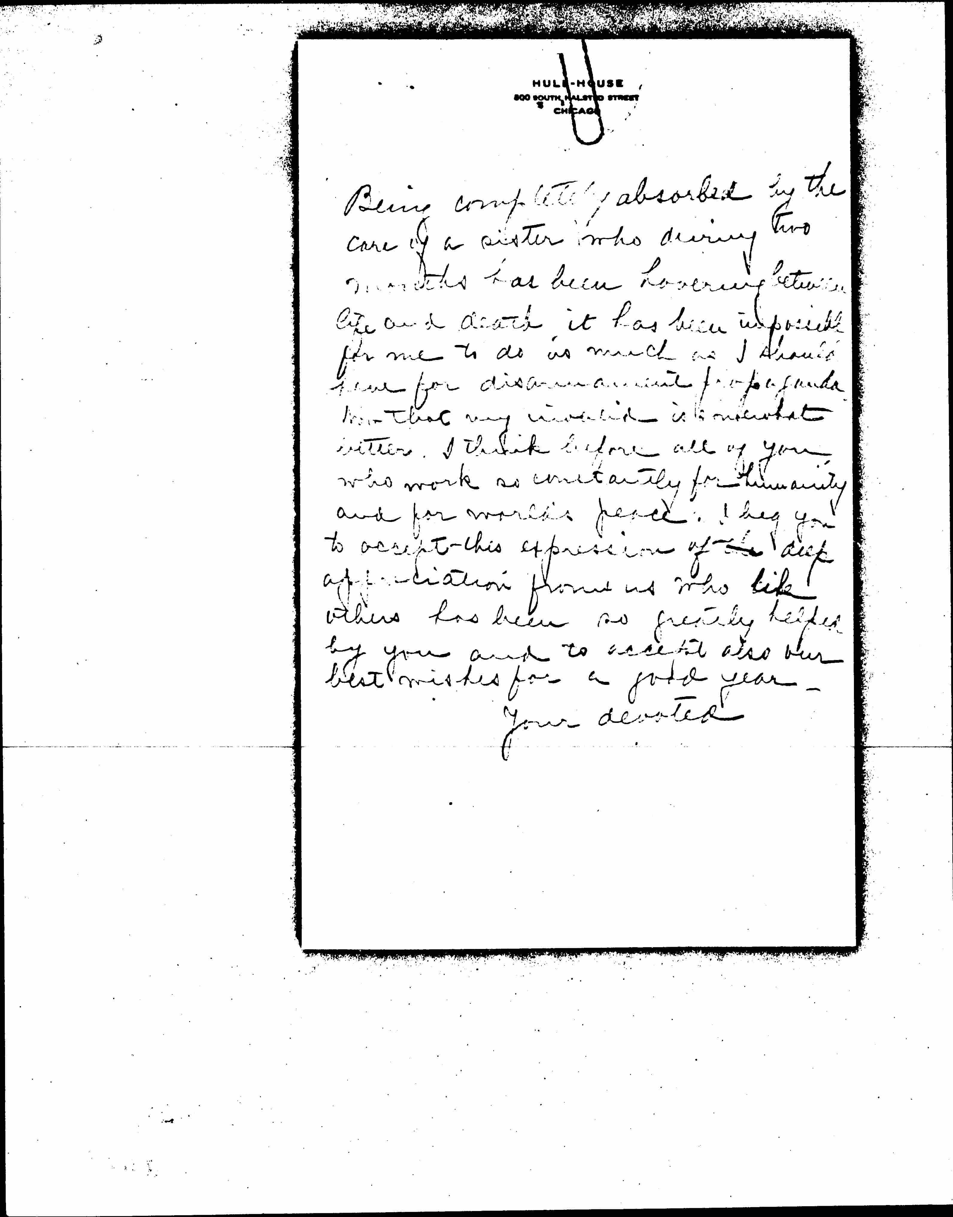 Being completely absorbed by the care of a sister who during two months has been hovering between life and death, it has been impossible for me to do as much as I should have for disarmament propaganda. [Now that my invalid is whomewhat better]. I think before all of you who work as constantly for humanity and for world's peace. I beg you to accept this expression of the deep appreciation from us who like others has been so greatly helped by you and to accept also our best wishes for a good year.