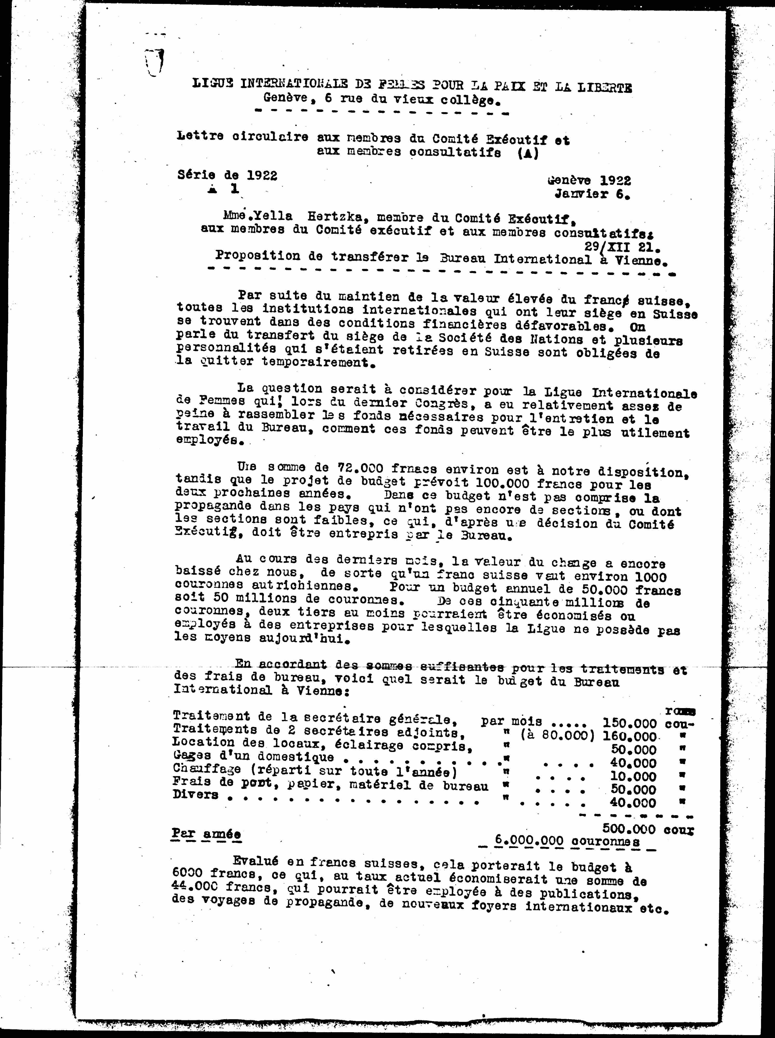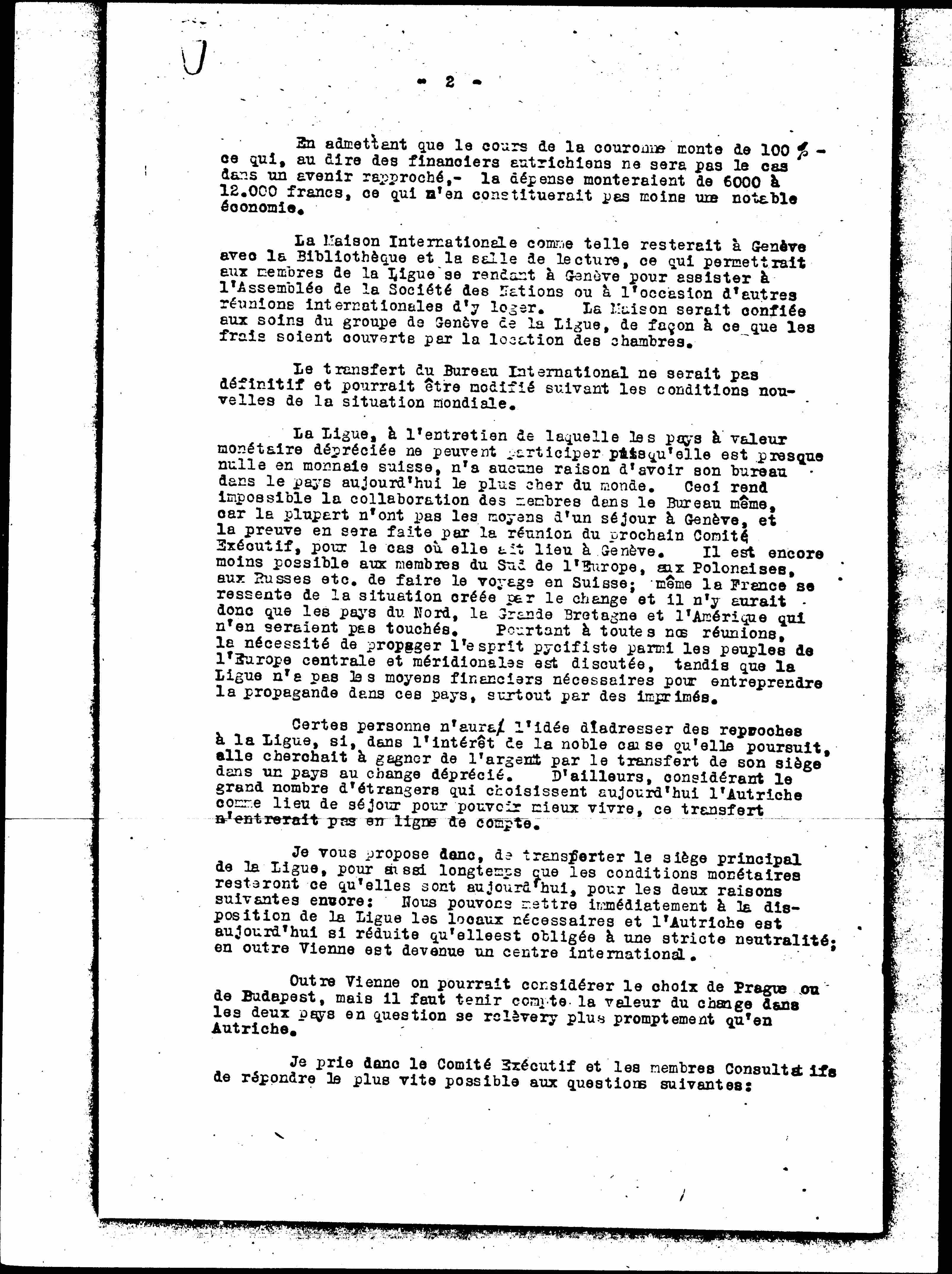 The League, in whose maintenance countries of depreciated monetary value cannot participate because it is almost nil in Swiss currency, has no reason to have its office in the most expensive country in the world today. This makes it impossible for the members to collaborate in the Bureau itself because most of them do not have the means to stay in Geneva, and this will be proved by the meeting of the next Executive Committee, in case it takes place in Geneva. . It is even less possible for members of southern Europe, Polonia, Russians etc. to make the trip to Switzerland; even France feels the situation created by the exchange rate and it would therefore only be the countries of the North, Great Britain and America that would not be affected. Yet at all our meetings, the need to propagate the spirit [pacifist] among the peoples of central and southern Europe is discussed, while the League does not have the financial means to undertake propaganda in these countries, especially by printed.