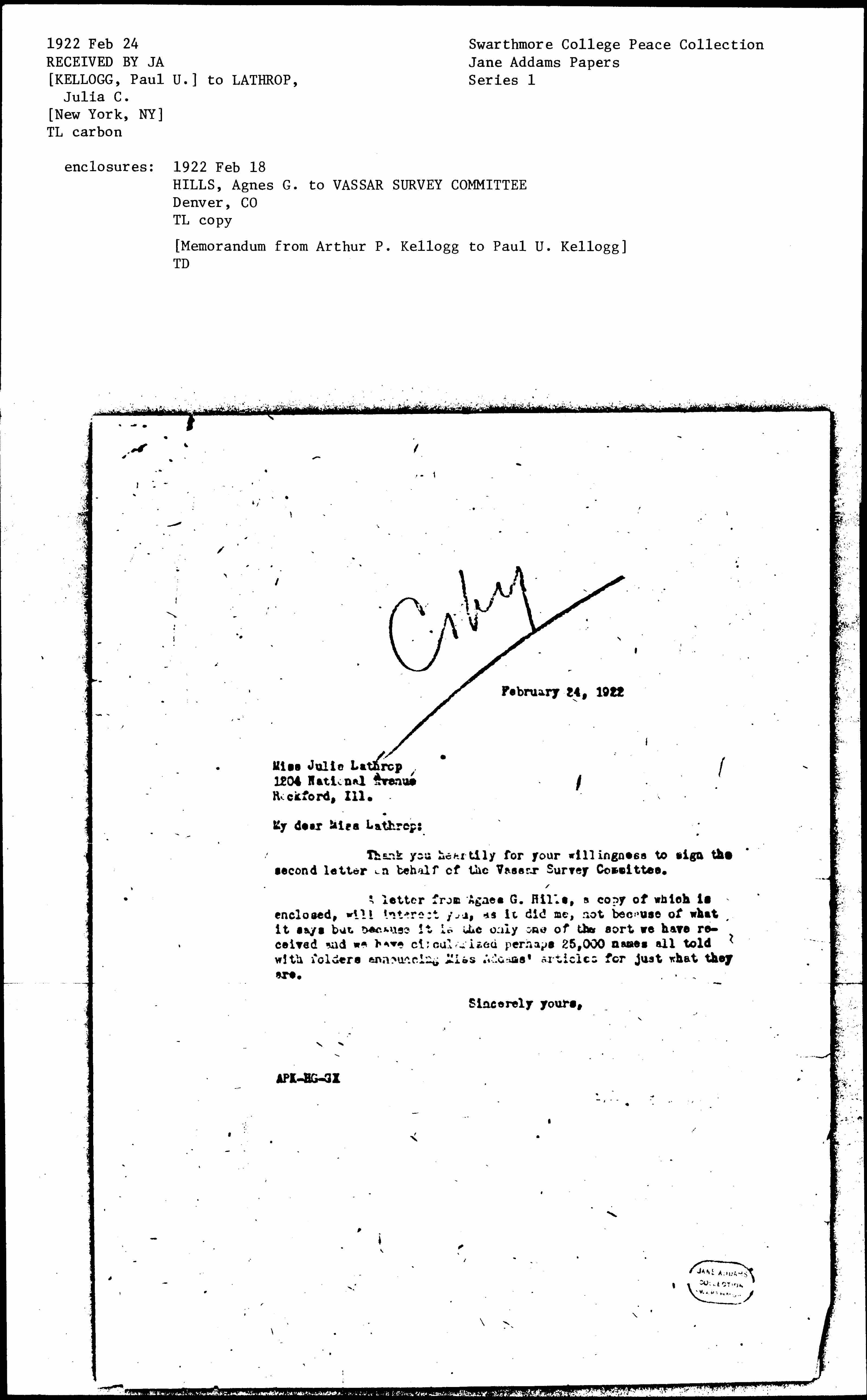 A letter from Agnes G. Hills, a copy of which is enclosed, will interest you, as it did me, not because of what it says but because it is the only one of the sort we have received and we have circularized perhaps 25,000 names all told with folders announcing Miss Addams' articles for just what they are.