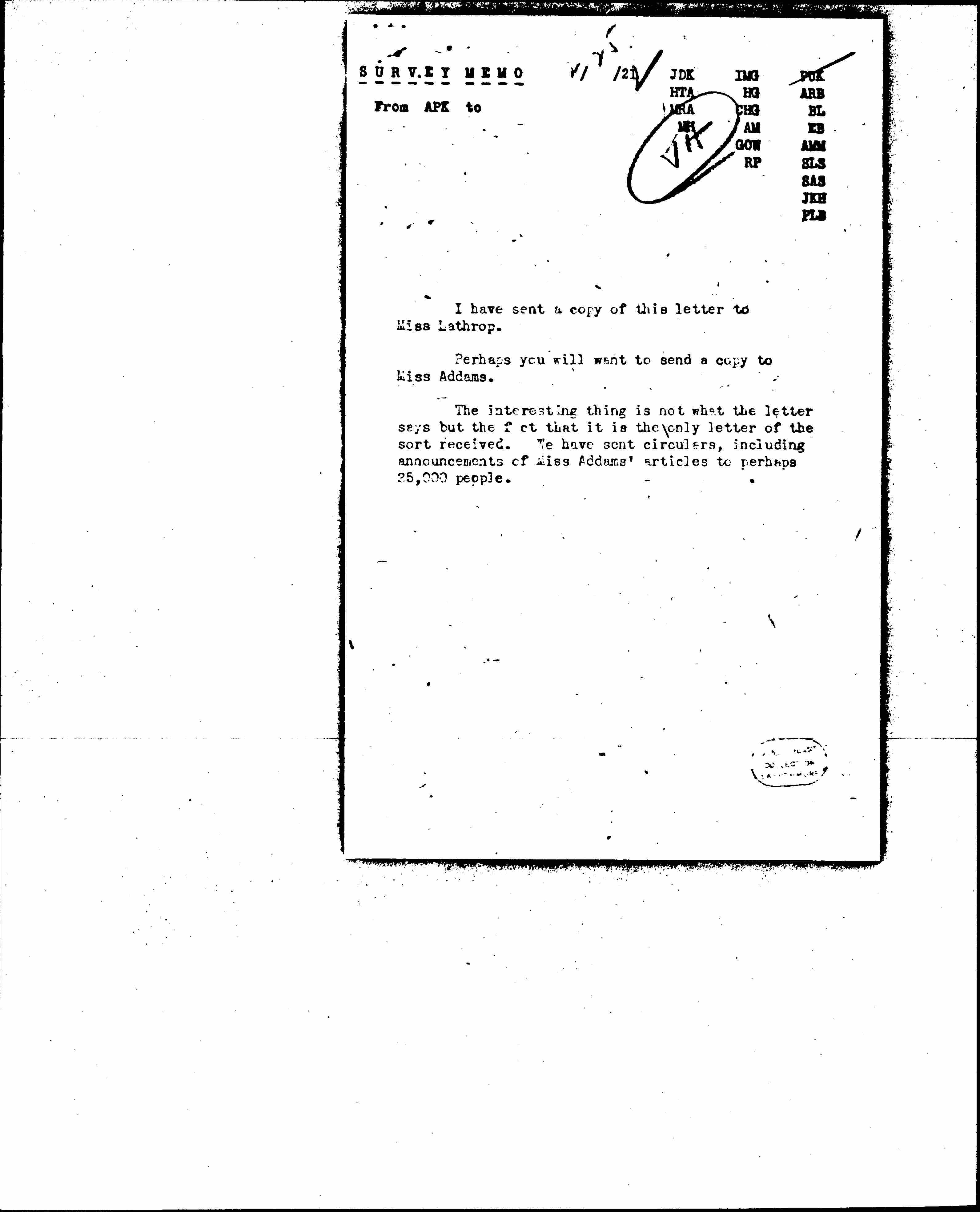 The interesting thing is not what the letter says but the fact that it is the only letter of the sort received. We have sent circulars, including announcements of Miss Addams' articles to perhaps 25,000 people.