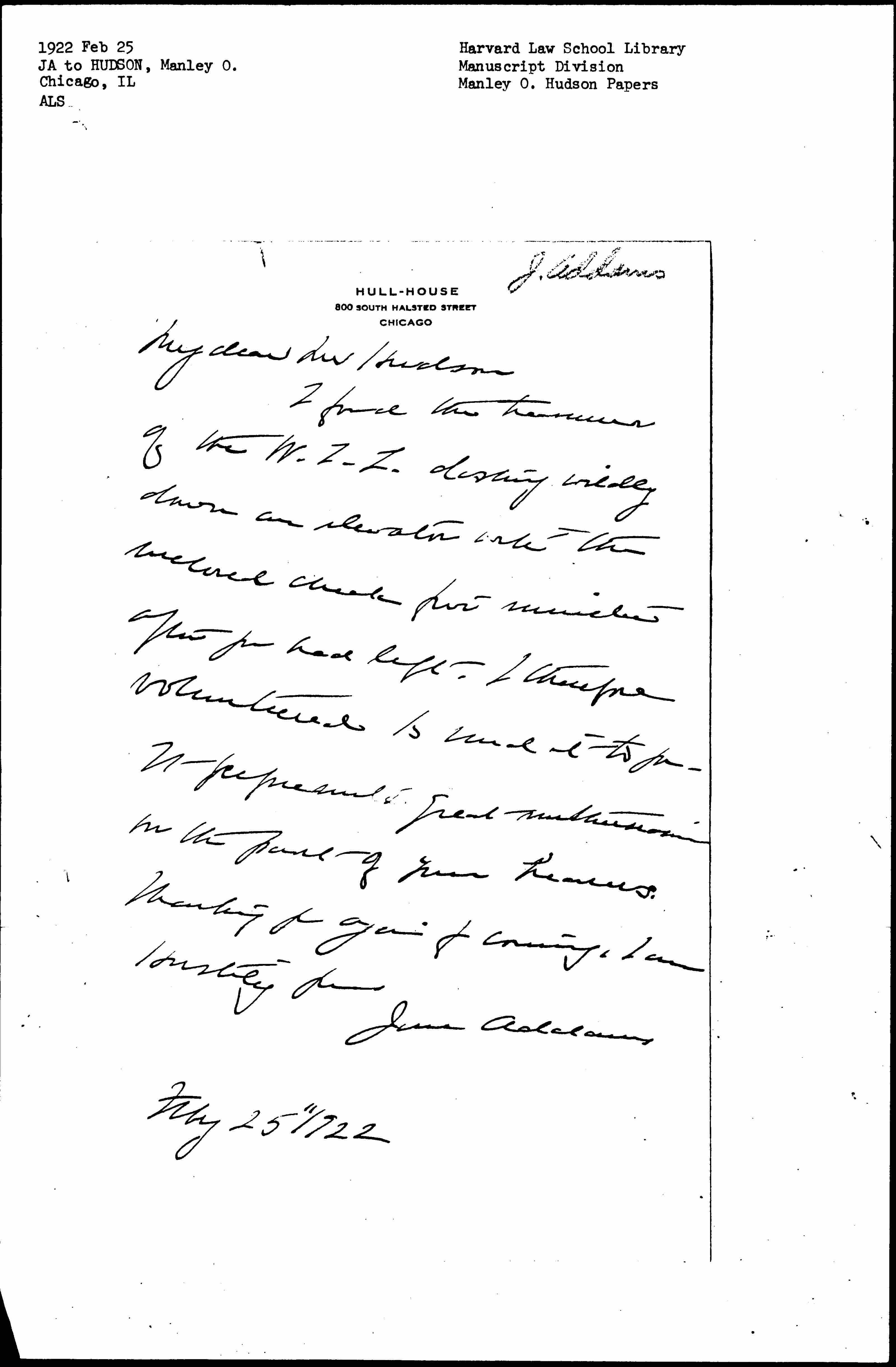 I found the treasurer of the W.I.L. dashing wildly down an elevator with the enclosed check five minutes after you had left. I therefore volunteered to send it to you. It [represents] great enthusiasm on the part of your hearers. Thanking you again for coming, I am