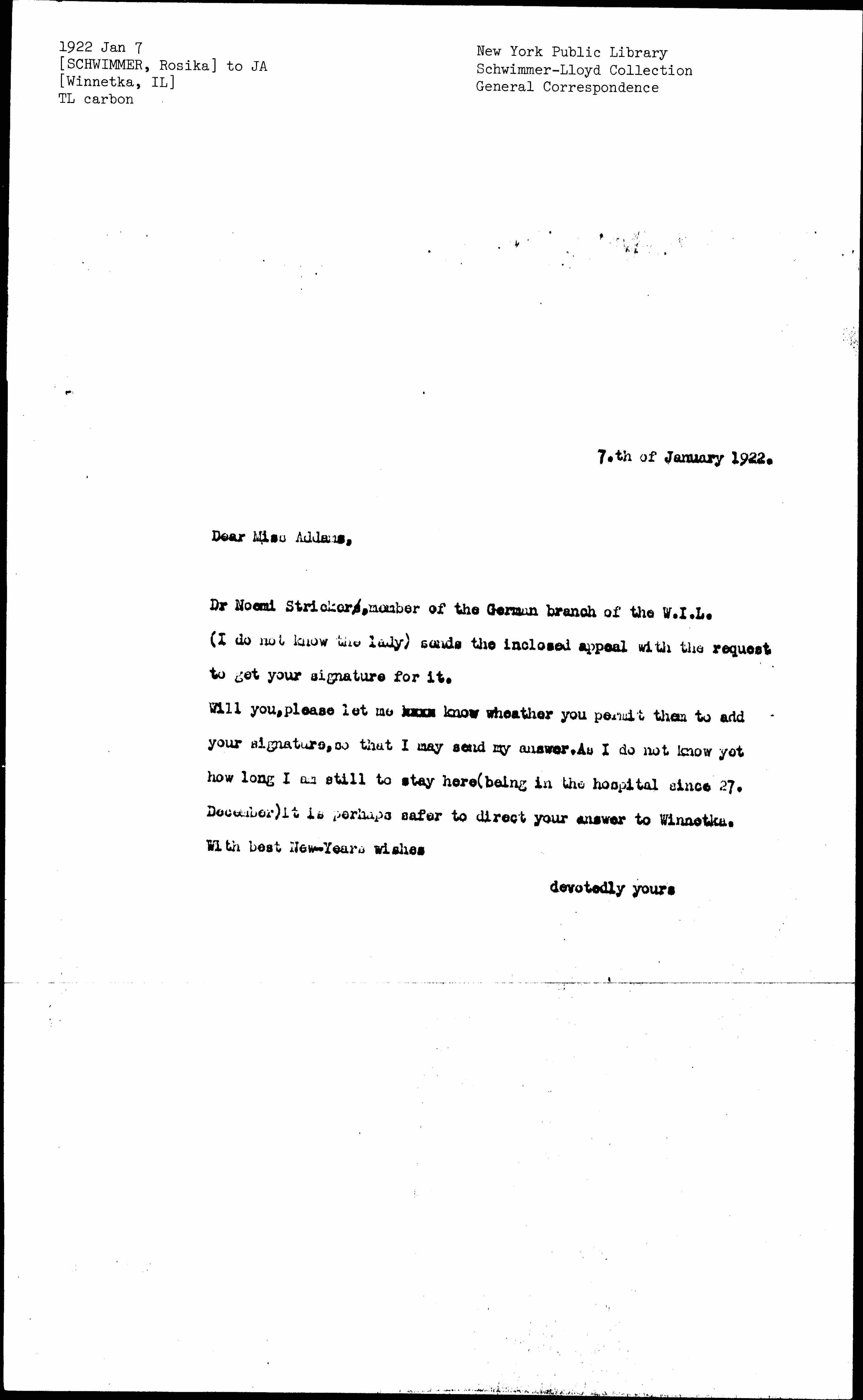 Dr Noémi Stricker, member of the German branch of the W.I.L. (I do not know the lady) sends the [enclosed] appeal with the request to get your signature for it.