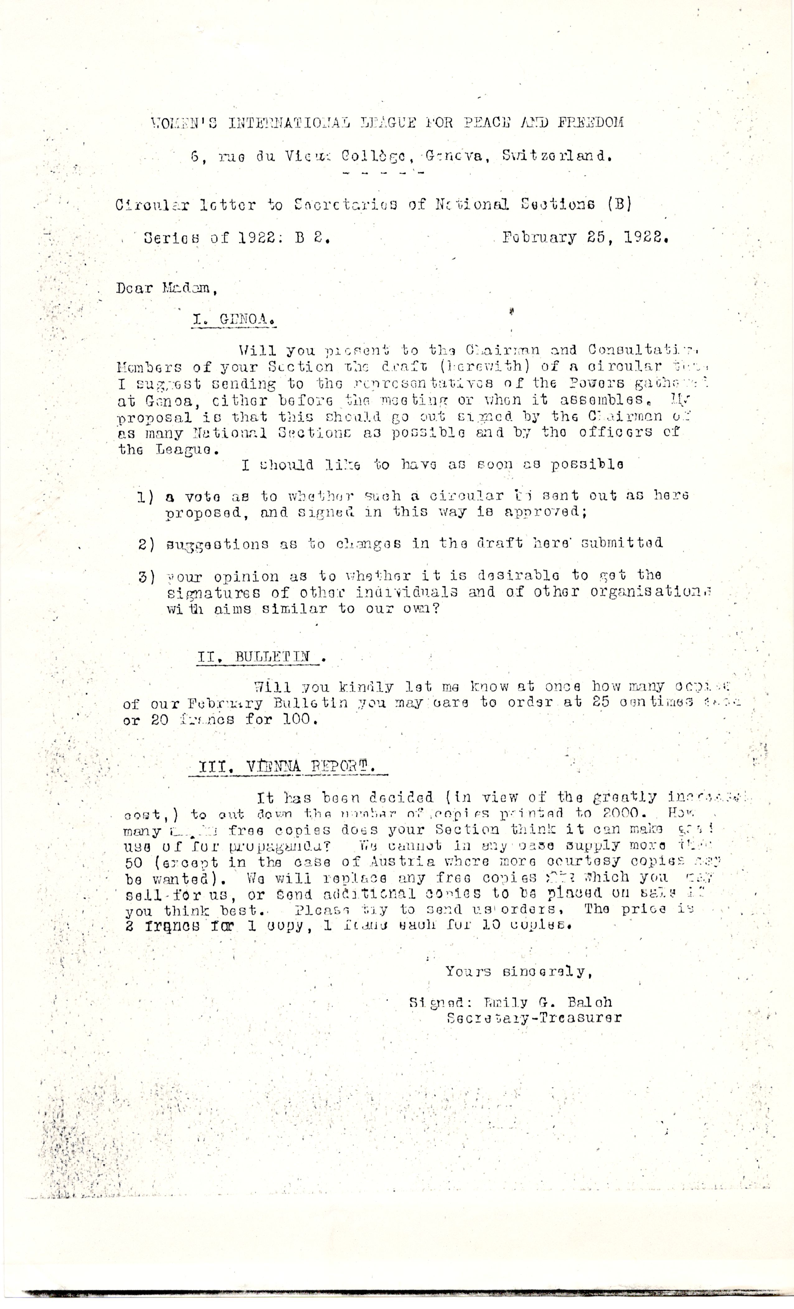 Will you present to the Chairman and Consultative Members of your Section the draft (herewith) of a circular that I suggest sending to the representative of the Powers gathered at Genoa, either before the meeting or when it assembles. My proposal is that this should go out signed by the Chairman of as many National Sections as possible and by the officers of the League.