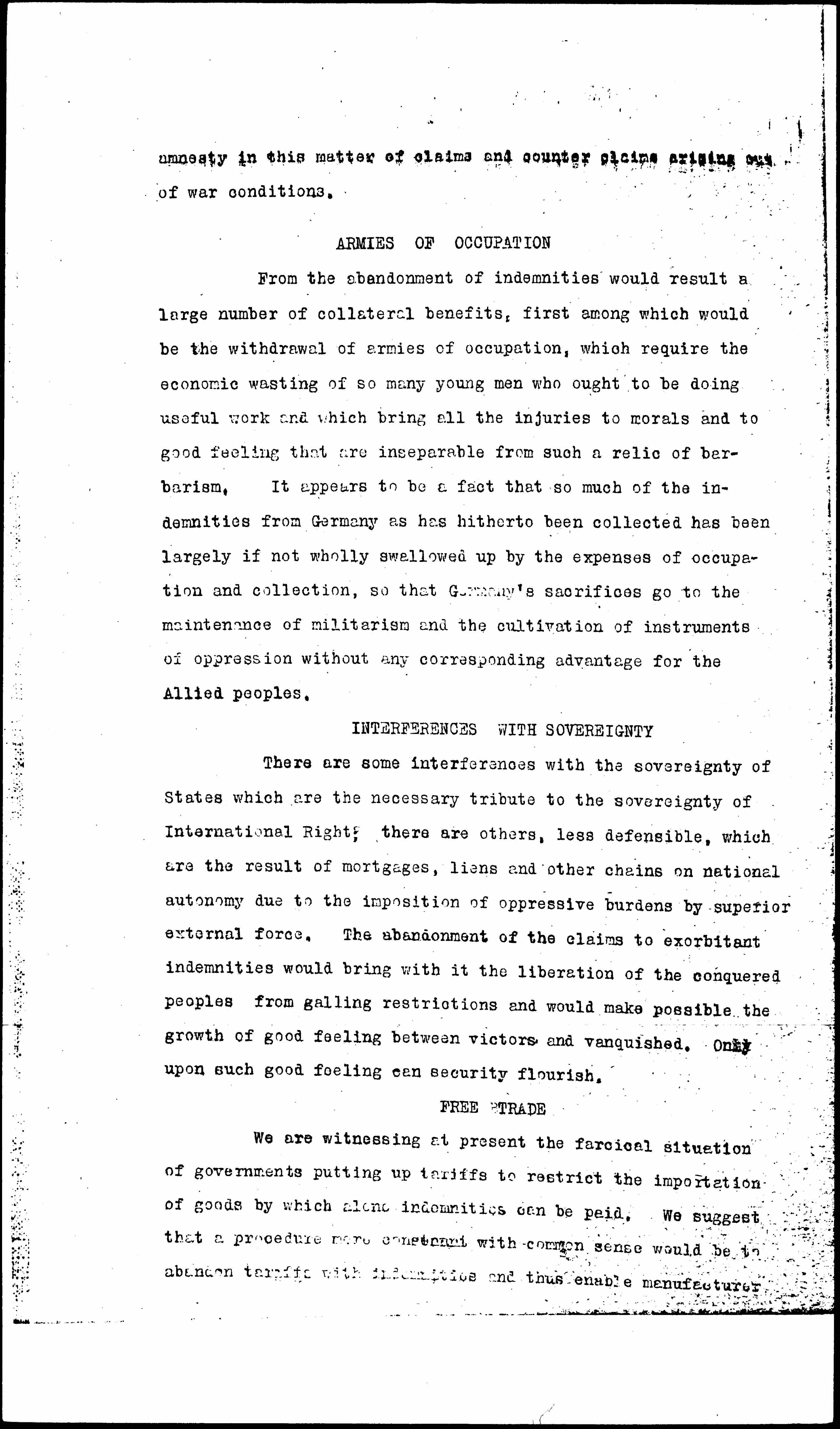 We suggest, then, that the wisest step to take would be to cut losses and simplify the problem by the cancellation of war-debts and indemnities. Even after the bloodiest insurrections, it is [old?] wisdom to proclaim universal amnesty. We propose a universal [page 3] amnesty in this matter of claims and counter claims arising out of war conditions.