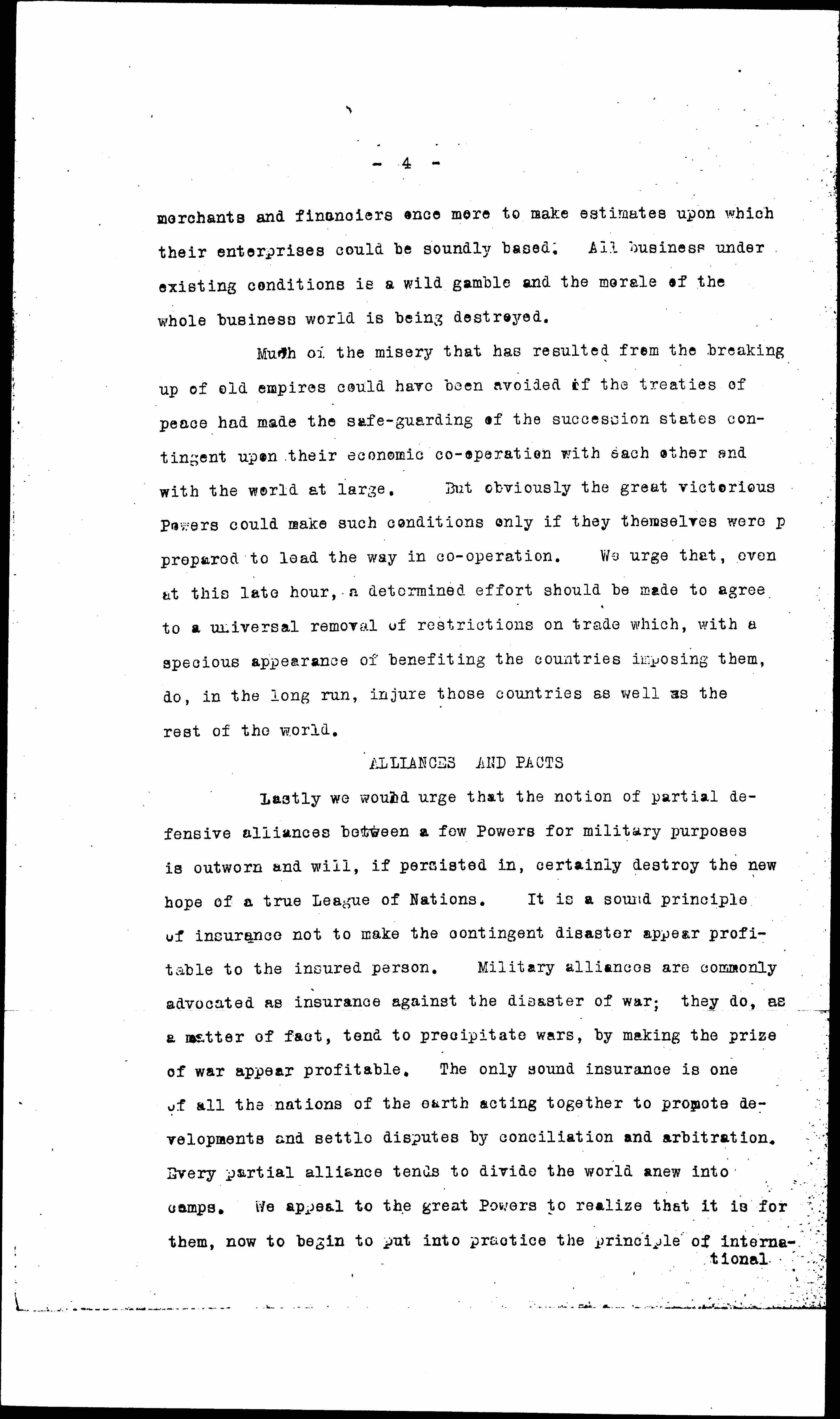 Lastly we would urge that the notion of partial defensive alliances between a few Powers for military purposes is outworn and will, if persisted in, certainly destroy the new hope of a true League of Nations. It is a sound principle of insurance not to make the contingent disaster appear profitable to the insured person. Military alliances are commonly advocated as insurance against the disaster of war; they do, as a matter of fact, tend to precipitate wars, by making the prize of war appear profitable. The only sound insurance is one of all the nations of the earth acting together to promote developments and settle disputes by conciliation and arbitration. Every partial alliance tends to divide the world anew into camps. We appeal to the great Powers to realize that it is for them, now to begin to put into practice the principle of international [page 5] [cooperation] and that the first steps must be to make an association which shall take in all nations and to treat the claims of the smaller and weaker nations as well as those of the nations vanquished in the Great War, with as much respect and impartiality as those of the greatest and most successful.