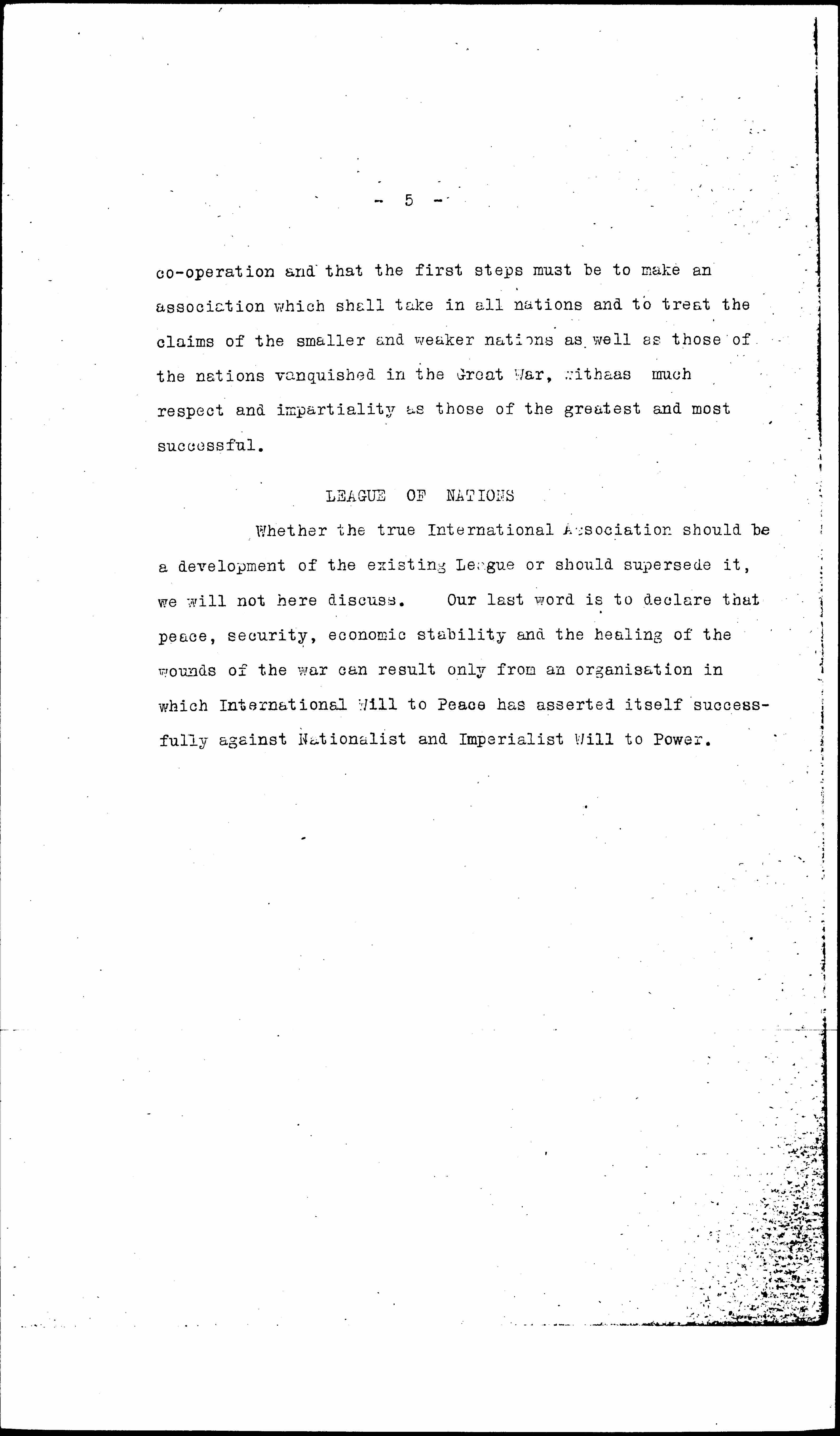Whether the true International Association should be a development of the existing League or should supersede it, we will not here discuss. Our last word is to declare that peace, security, economic stability and the healing of the wounds of the war can result only from an [organization] in which International Will to Peace has asserted itself successfully against Nationalist and Imperialist Will to Power.