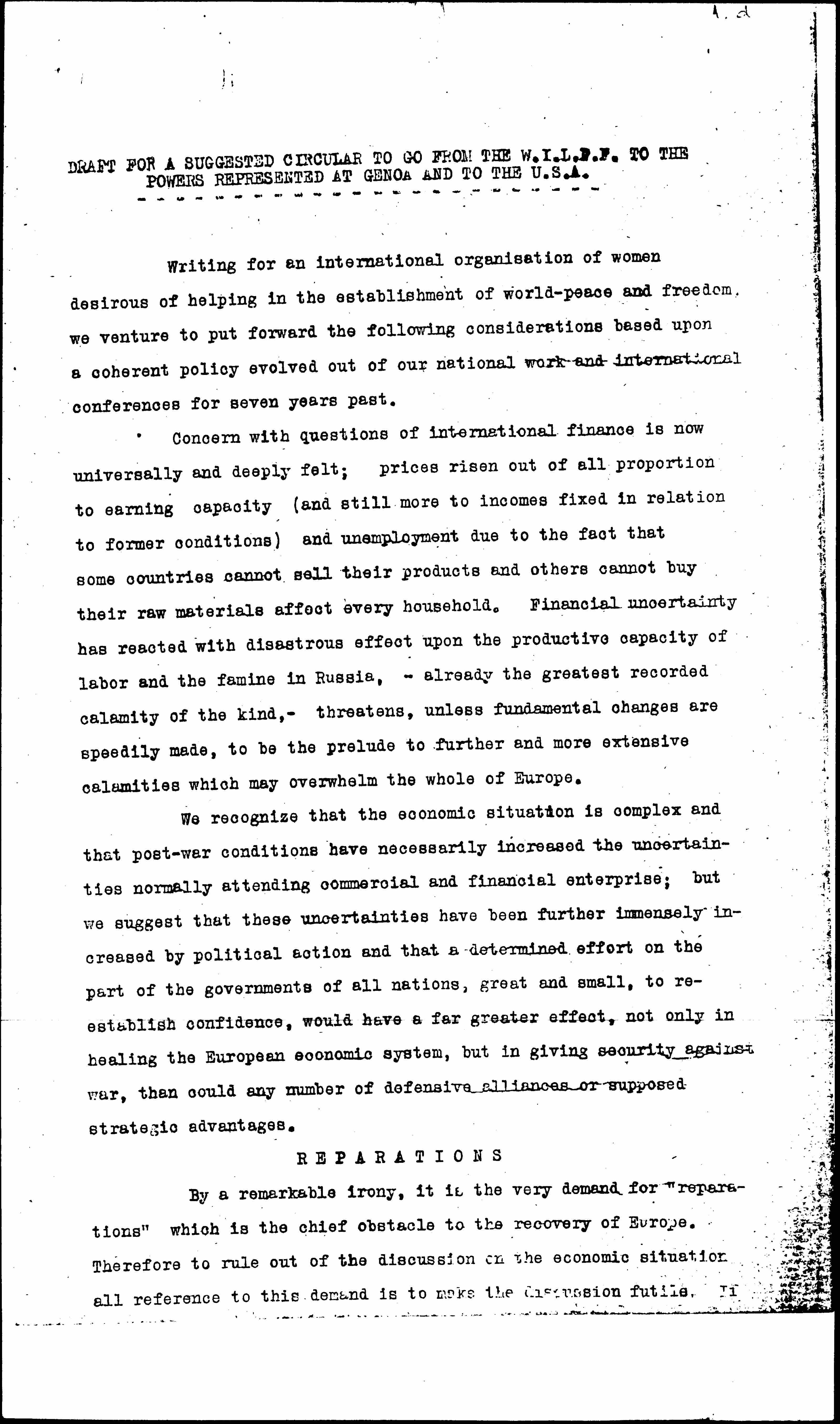 DRAFT FOR A SUGGESTED CIRCULAR TO GO FROM THE W.I.L.P.F. TO THE POWERS REPRESENTED AT GENOA AND TO THE U.S.A.