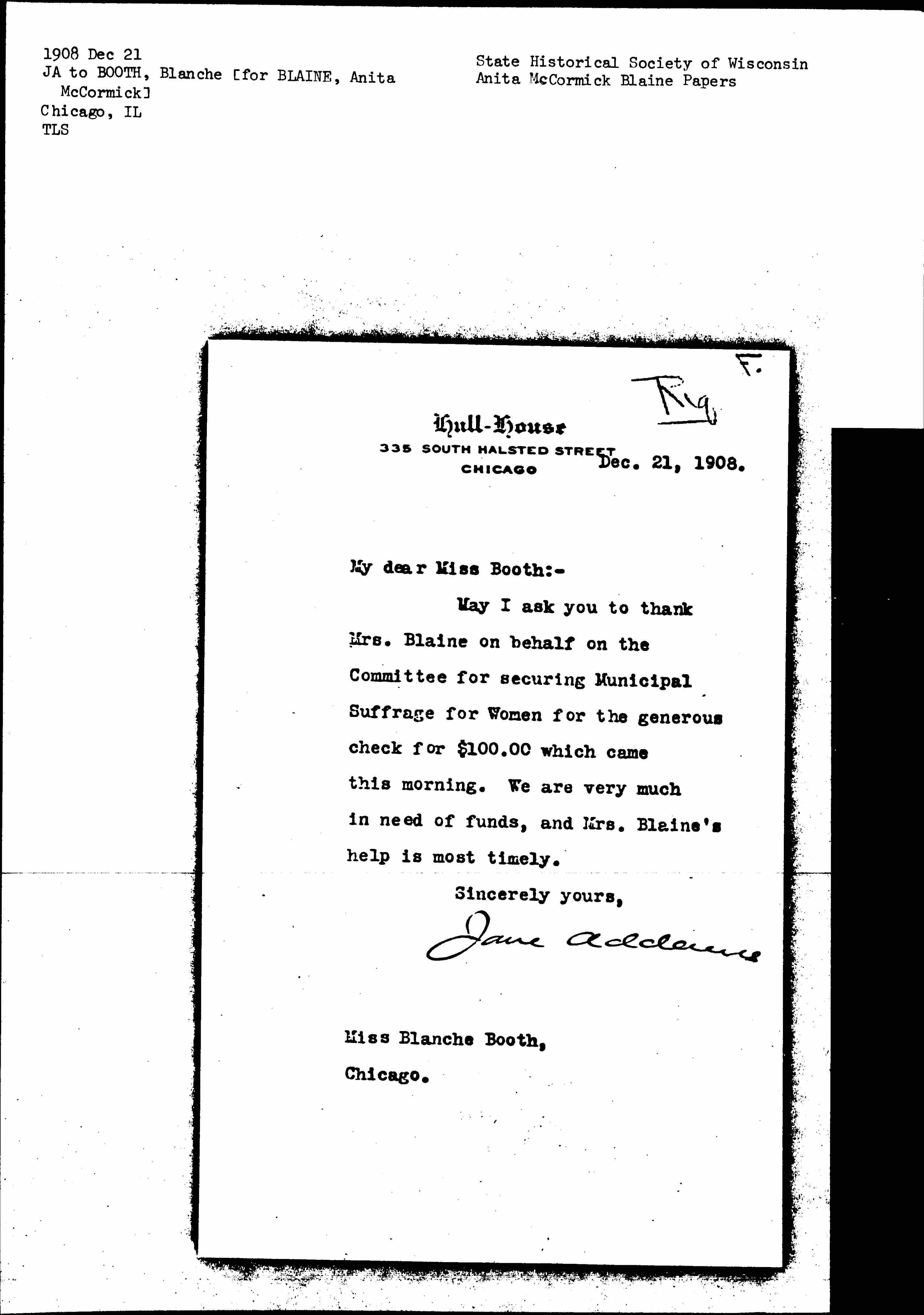 May I ask you to thank Mrs. Blaine on behalf [of] the Committee for securing Municipal Suffrage for Women for the generous check for $100.00 which came this morning. We are very much in need of funds, and Mrs. Blaine's help is most timely.