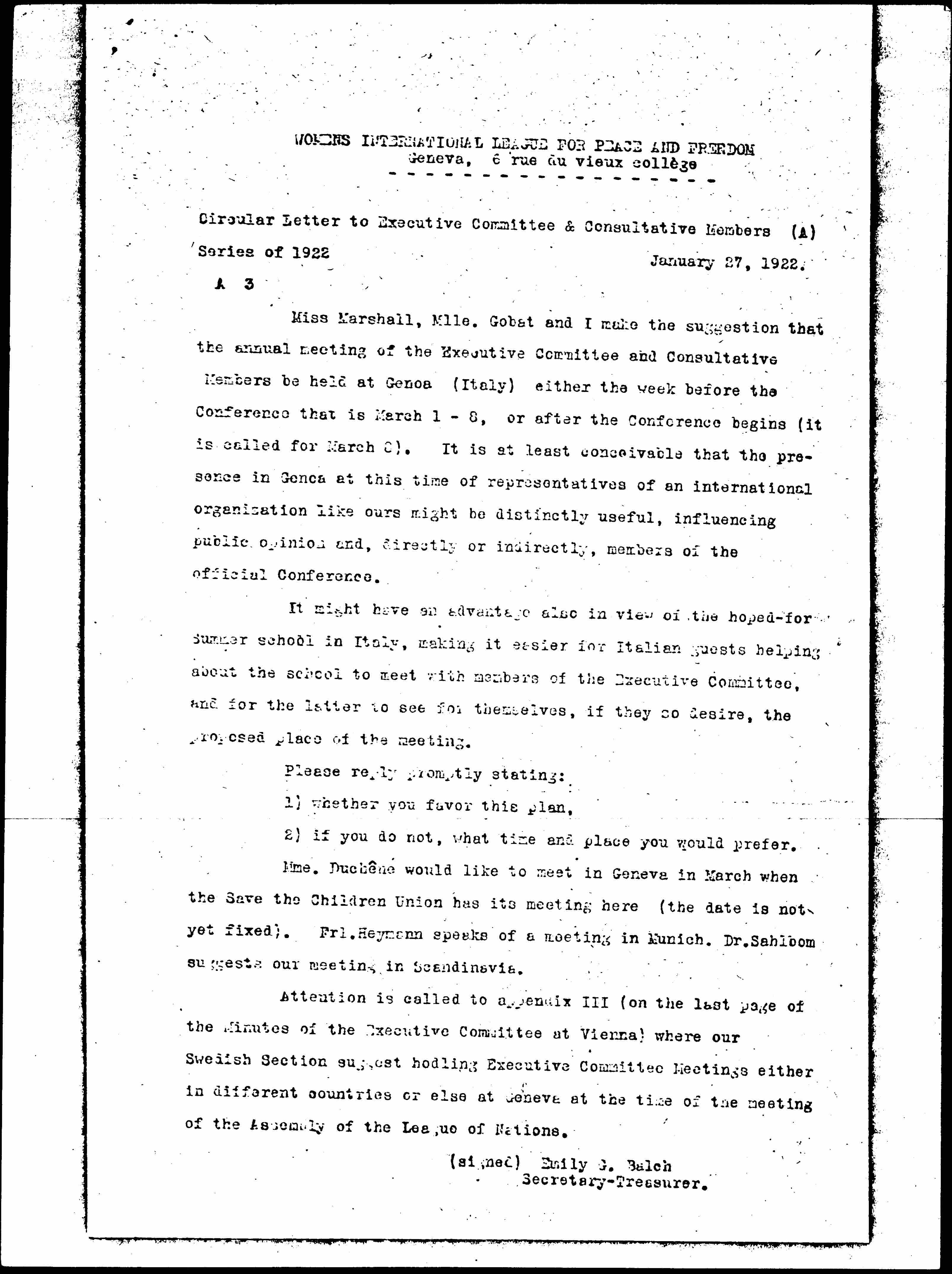 Miss Marshall, Mlle. Gobat and I make the suggestion that the annual meeting of the Executive Committee and Consultative Members be held at Genoa (Italy) either the week before the Conference that is March 1-8, or after the Conference begins (it is called for March 8). It is at least conceivable that the presence in Genoa at this time of representatives of an international organization like ours might be distinctly useful, influencing public opinion and, directly or indirectly, members of the official Conference.