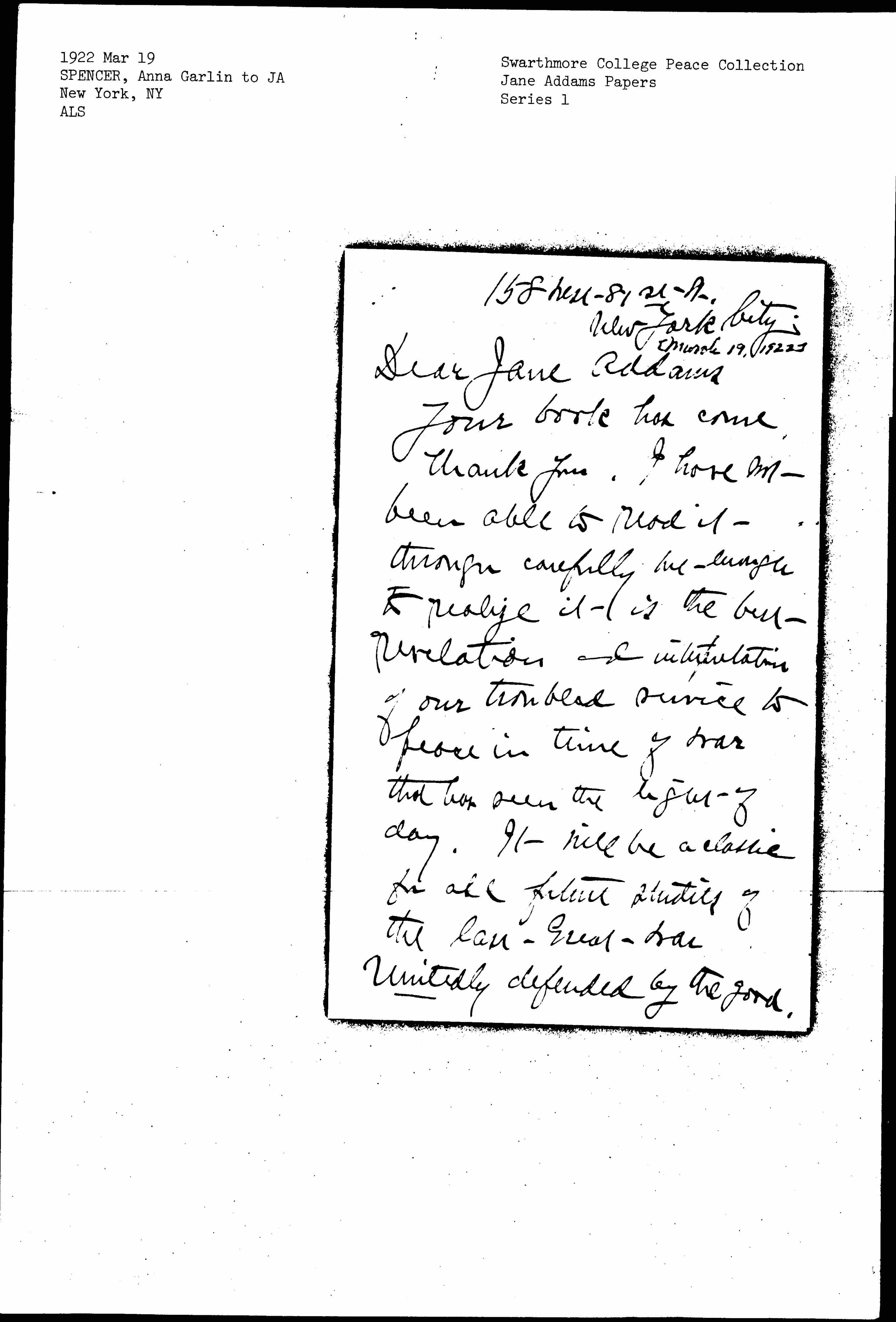 Your book has come. Thank you. I have not been able to read it through carefully but enough to realize it is the best revelation and interpretation of our troubled service to peace in time of war that has seen the light of day. It will be a classic for all future studies of the last Great War Unitedly defended by the good, [page 2] save for a "despised remnant." Hereafter there may be wars but the split between the good who defend and the good who oppose will show more equal numbers on either side. With all humility he may say he fell across the chasm to help make a road over which others may pass -- our children's children -- I wish so much I could come [page 3] see you before the meeting in April. If you are coming on to N.Y. let me know in [season?] please, to make an appointment -- I am submerged just now necessity for difficult decisions concerning my husband's care, selling of my house for necessary funds to meet extraordinary expenses. My lectures at Teacher's College Columbia University beginning in April and [page 4] a pledged book for Lippincott driving my hours -- but if I can see you for an hour it will be not only a balm and blessing but will enable me to speak of some things I hope may not be forgotten at the W.I.L.P.F meeting.