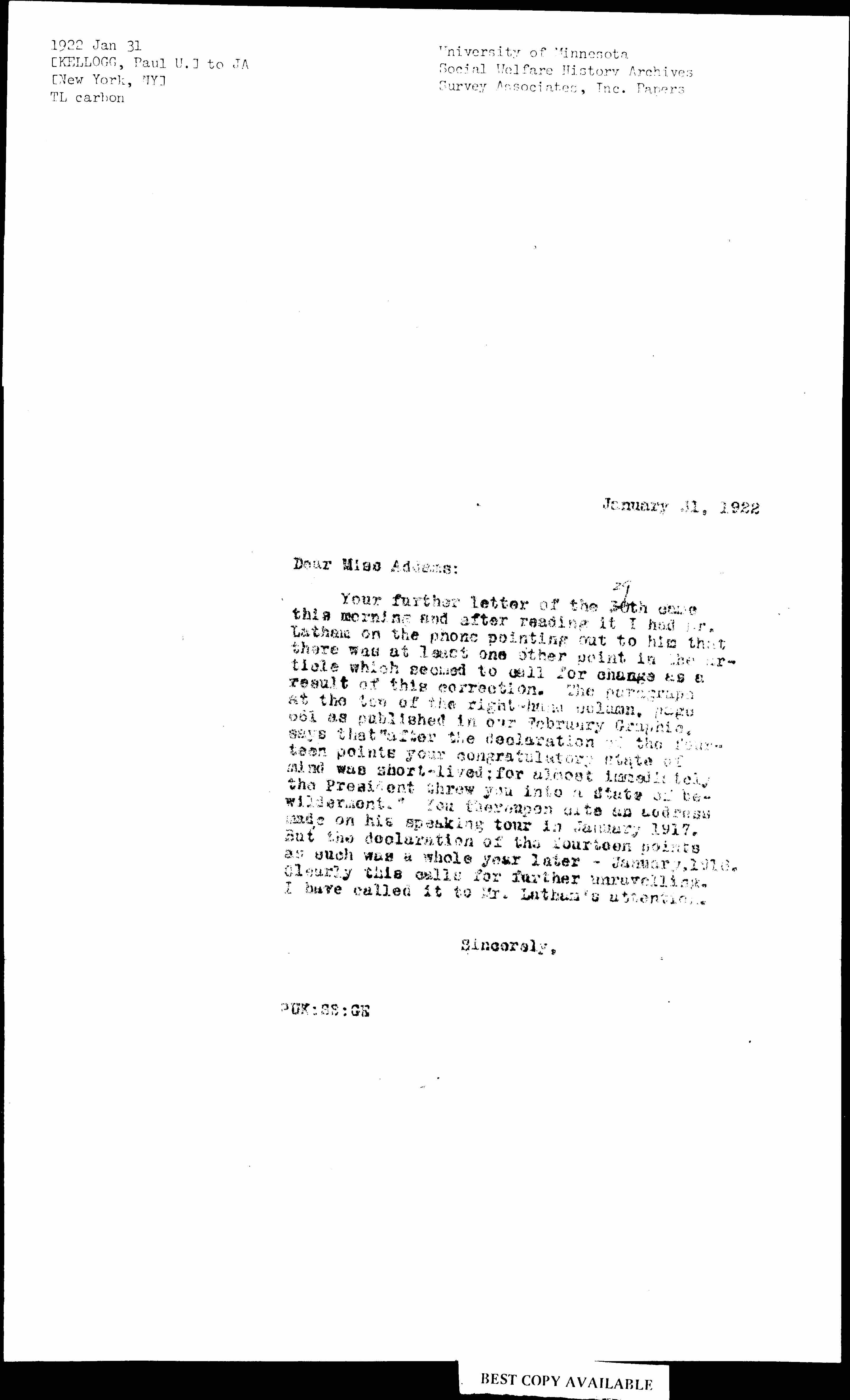 Your further letter of the 30th ↑29↓ came this morning and after reading it I had Mr. Latham on the phone pointing out to him that there was at least one other point in the article which seemed to call for change as a result of this correction. The paragraph at the top of the right-hand column, page 661 as published in our February Graphic, says that "after the declaration of the fourteen points your congratulatory state of mind was short-lived; for almost immediately the President threw you into a state of bewilderment." You thereupon cite an address made on his speaking tour in January 1917. But the declaration of the fourteen points as such was a whole year later -- January 1918. Clearly this calls for further unravelling. I have called it to Mr. Latham's attention.