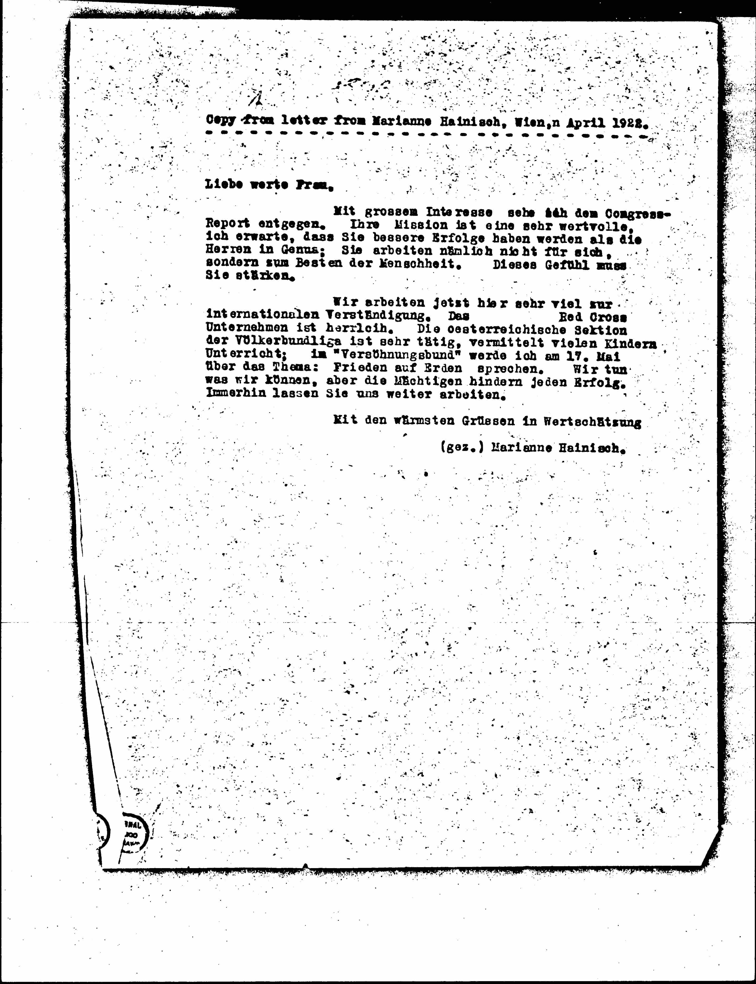 Copy from letter from Marianne Hainisch, Wien,n April 1922.