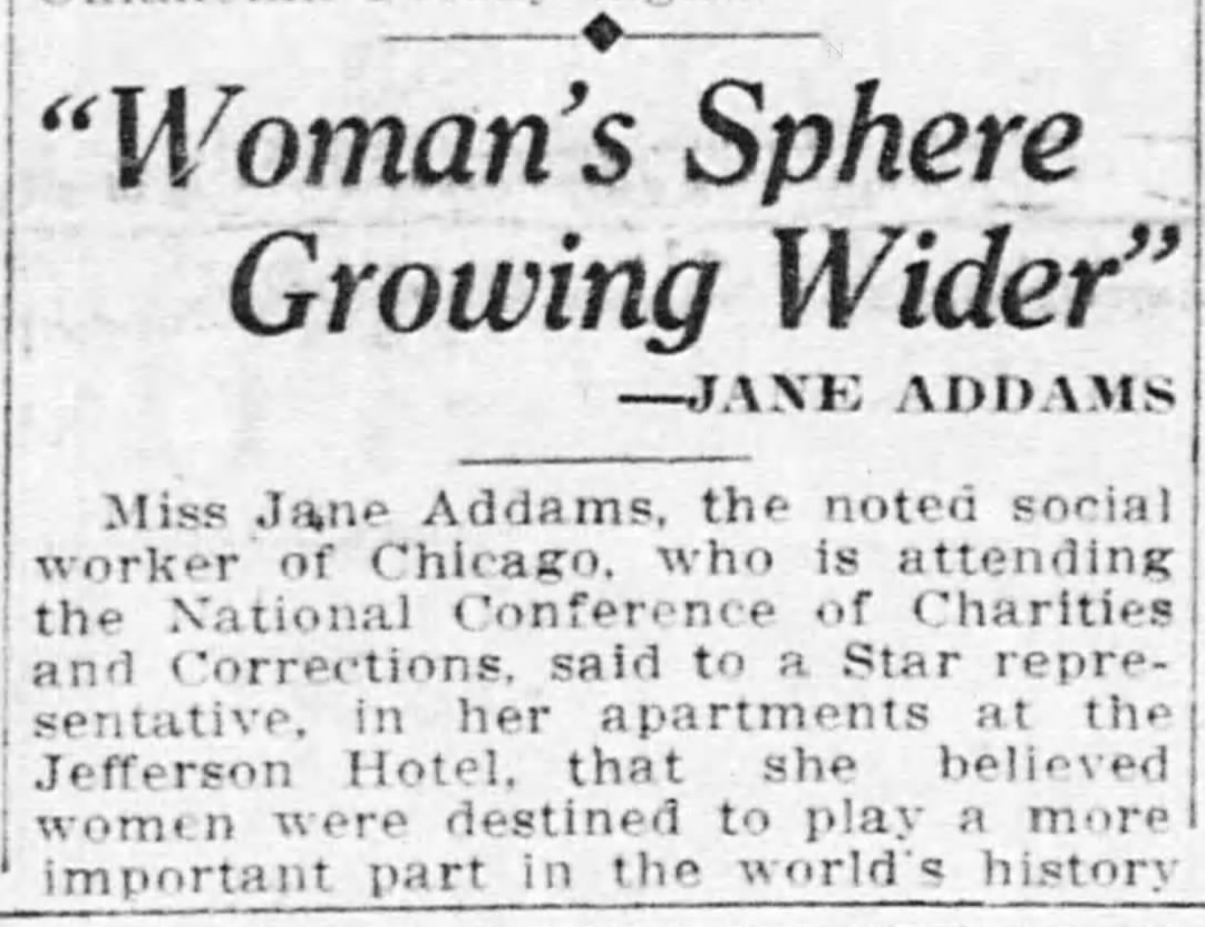 Miss Jane Addams, the noted social worker of Chicago, who is attending the National Conference of Charities and Corrections, said to a Star representative, in her apartments at the Jefferson Hotel, that she believed women were destined to play a more important part in the world's history [page 2] as the years go by, at least woman's sphere is widening and broadening out, instead of contracting or remaining unchanged, according to Miss Addams' view. This, she pointed out, did not mean a desertion of the domestic realm, but simply that her life would embrace more activities and become increasingly useful.