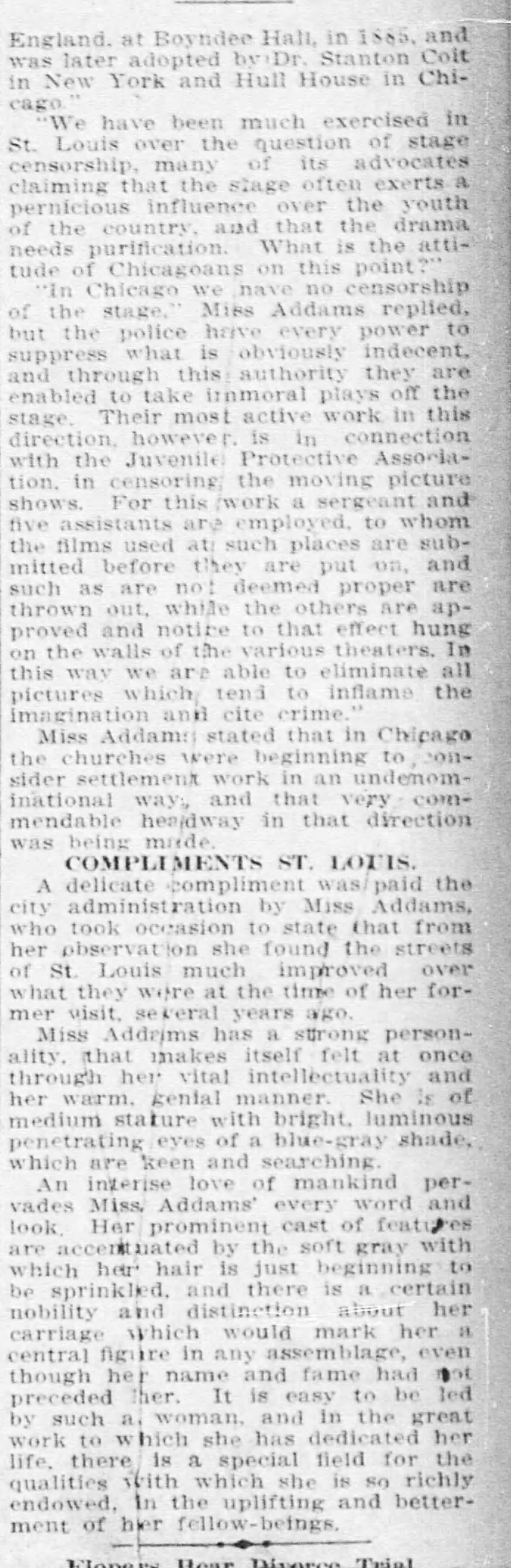 A delicate compliment was paid the city administration by Miss Addams, who took occasion to state that from her observation she found the streets of St. Louis much improved over what they were at the time of her former visit, several years ago.