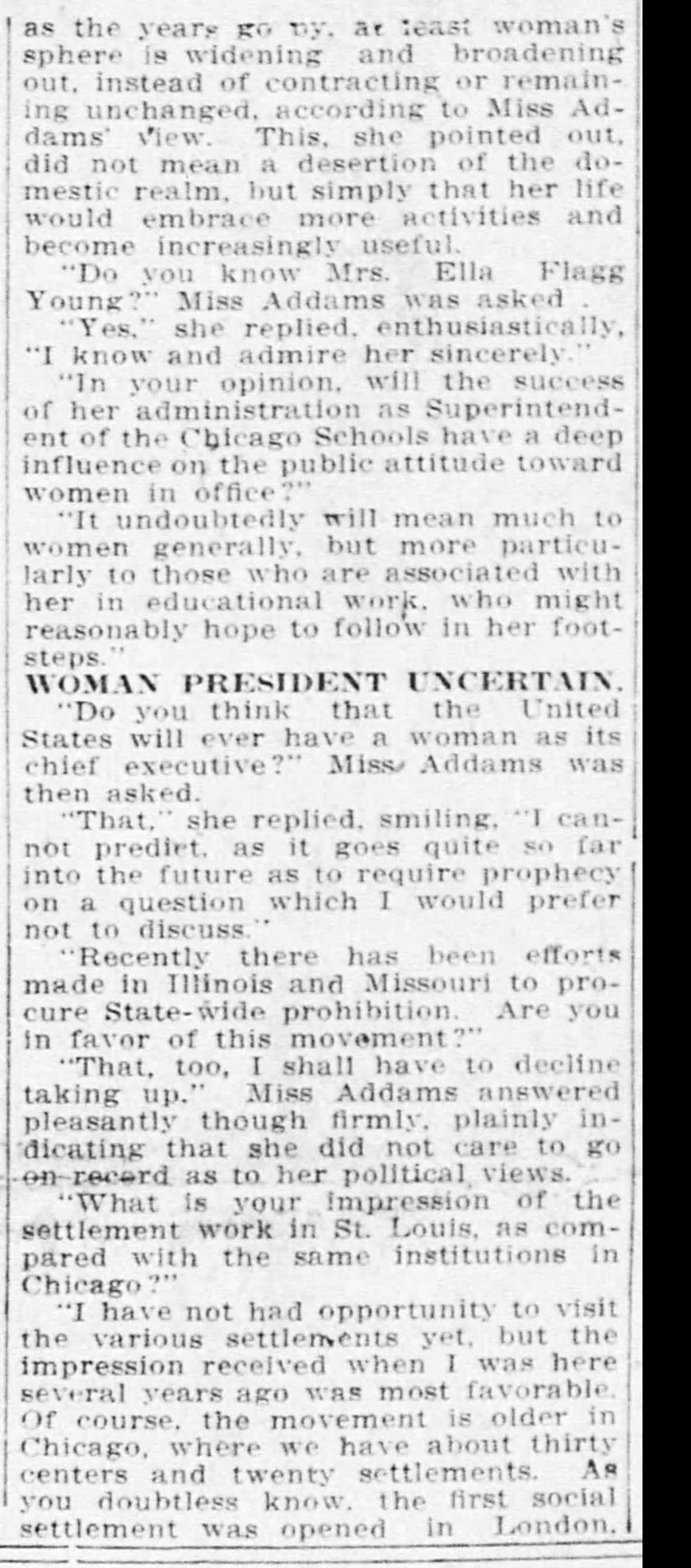 "Do you think that the United States will ever have a woman as its chief executive?" Miss Addams was then asked.