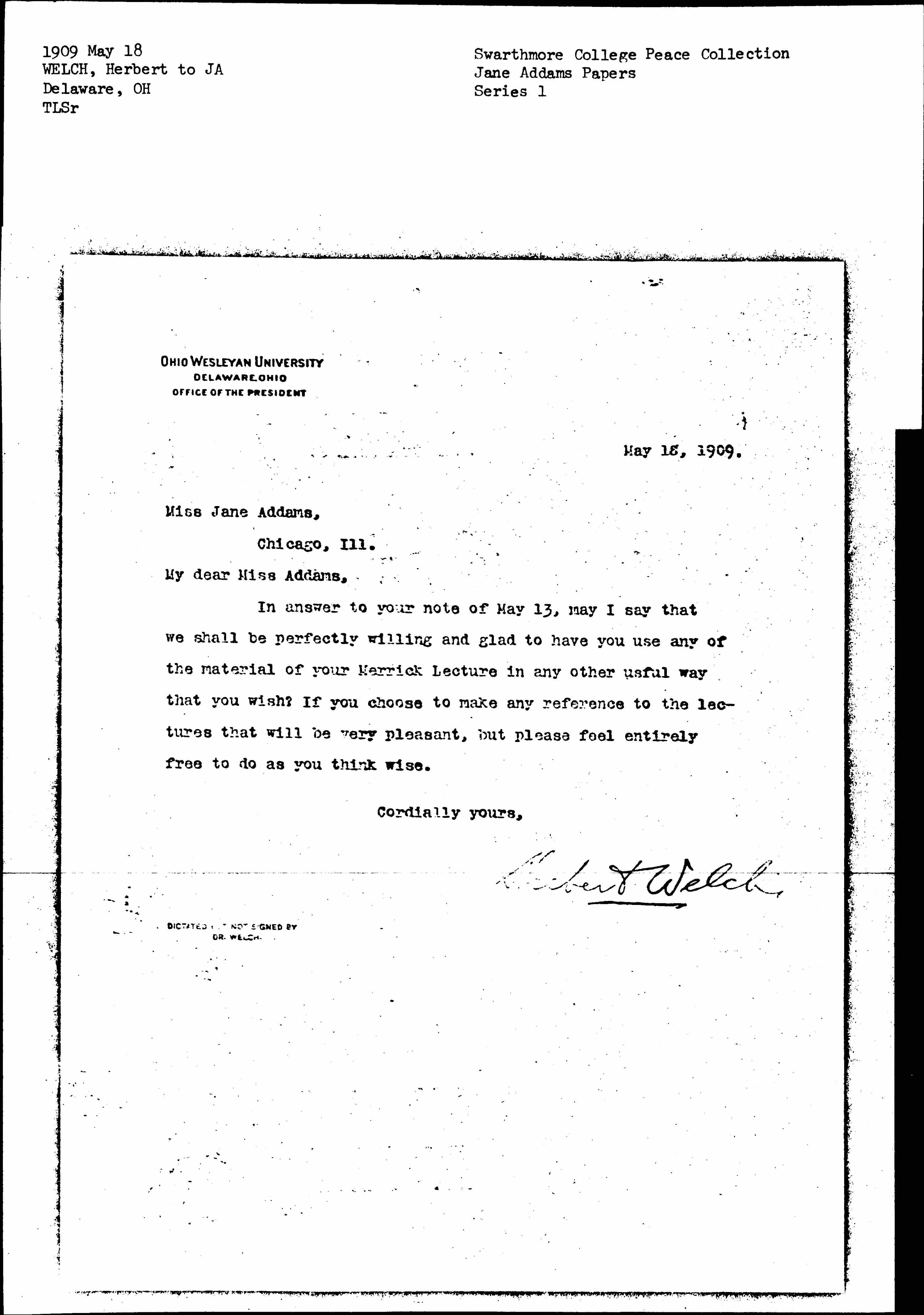 In answer to your note of May 13, may I say that we shall be perfectly willing and glad to have you use any of the material of your Merrick Lecture in any other useful way that you wish? If you choose to make any reference to the lectures that will be very pleasant, but please feel entirely free to do as you think wise.