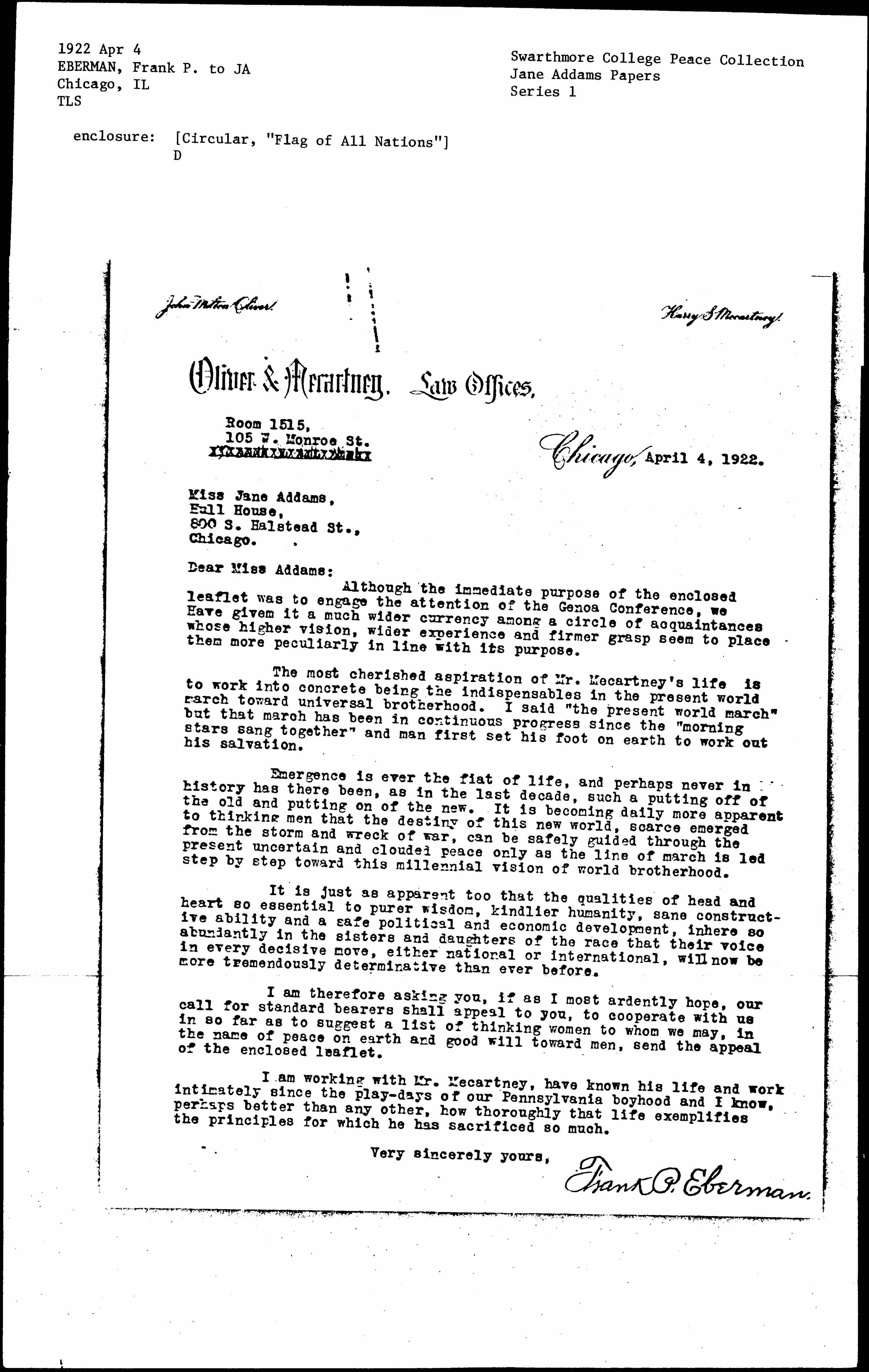 I am therefore asking you, if as I most ardently hope, our call for standard bearers shall appeal to you, to cooperate with us in so far as to suggest a list of thinking women to whom we may, in the name of peace on earth and good will toward men, send the appeal of the enclosed leaflet.