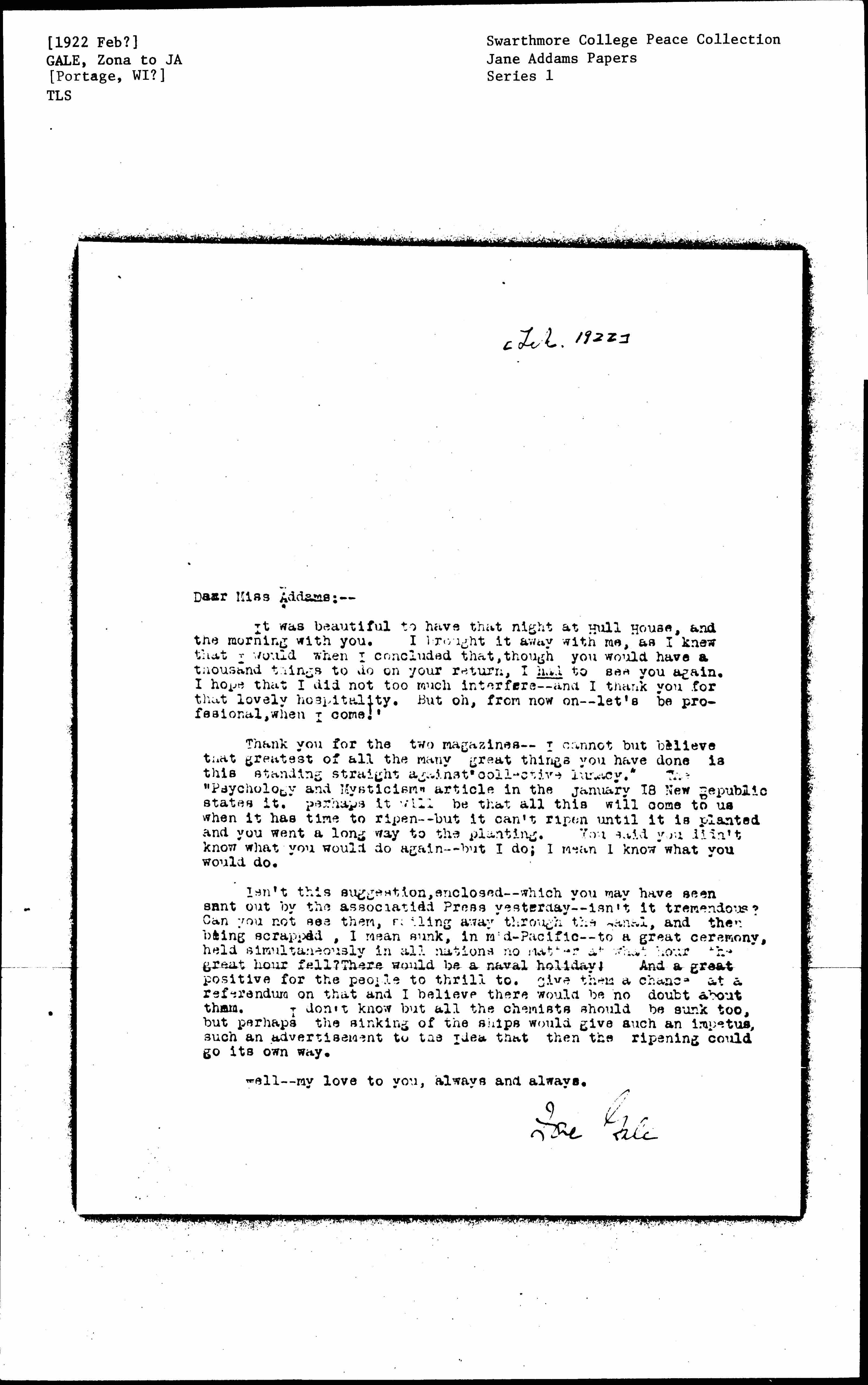 Isn't this suggestion, enclosed -- which you may have seen sent out by the Associated Press yesterday -- isn't it tremendous? Can you not see them, sailing away through the [canal], and then being scrapped, I mean sunk, in mid-Pacific -- to a great ceremony, held simultaneously in all nations no matter at what hour the great hour fell? There would be a naval holiday! And a great positive for the people to thrill to. Give them a chance at a referendum on that and I believe there would be no doubt about them. I don't know but all the chemists should be sunk too, but perhaps the sinking of the ships would give such an impetus, such an advertisement to the idea that then the ripening could go its own way.