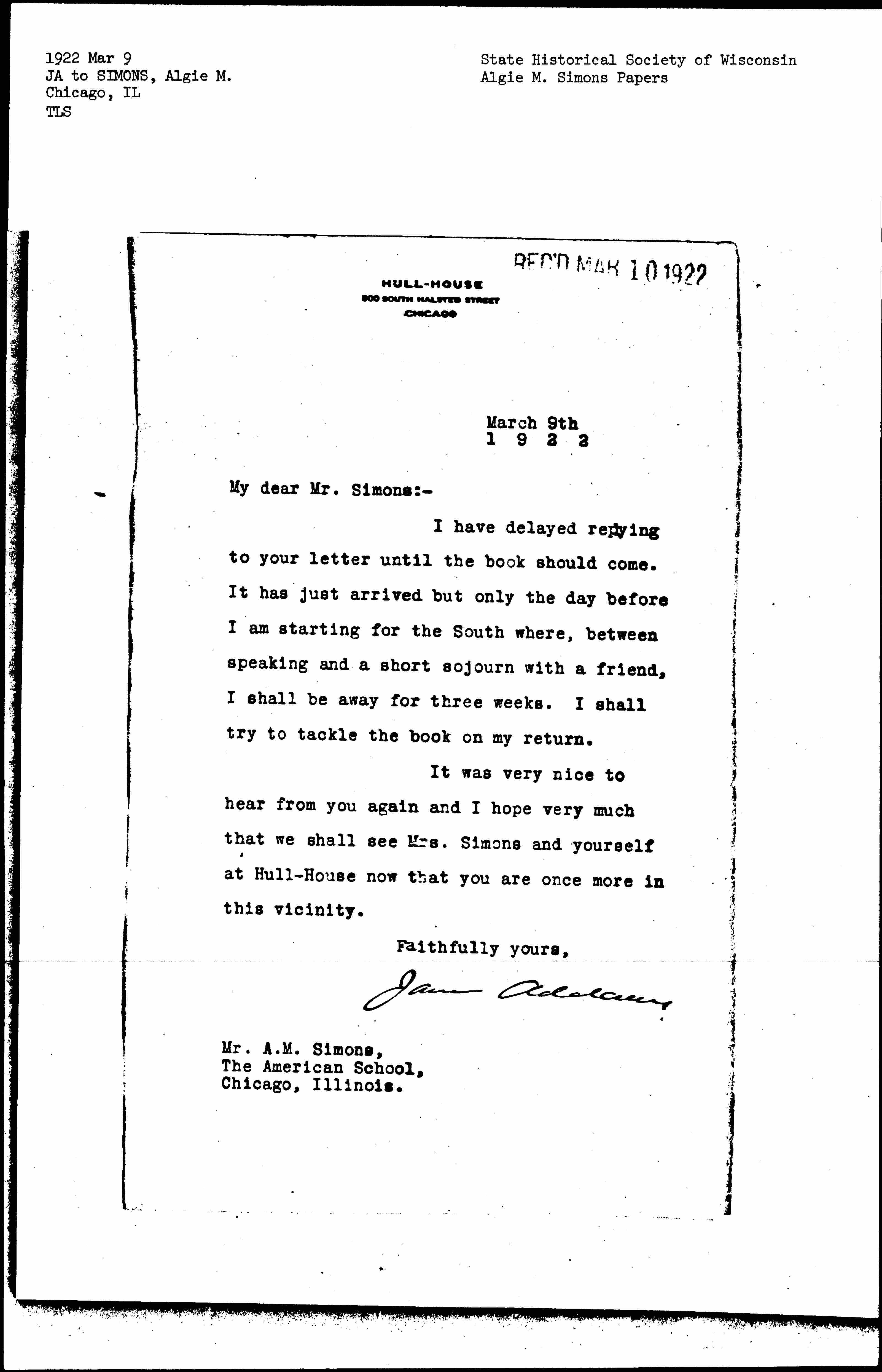 It was very nice to hear from you again and I hope very much that we shall see Mrs. Simons and yourself at Hull-House now that you are once more in this vicinity.