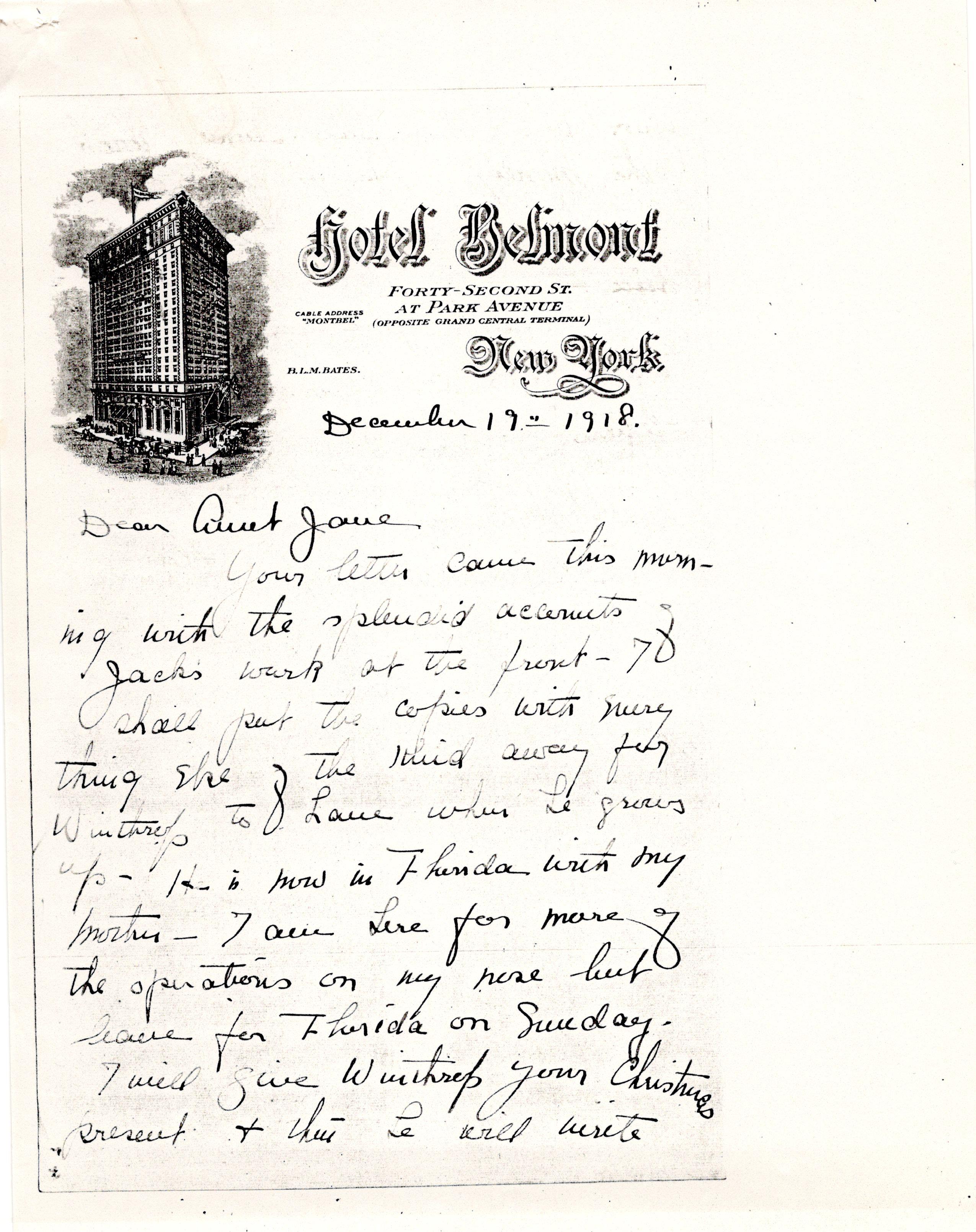 Your letter came this morning with the splendid accounts of Jack's work at the front. I shall put the copies with everything else of the kind away for Winthrop to have when he grows up. He is now in Florida with my mother. I am here for more of the operations on my nose but leave for Florida on Sunday.