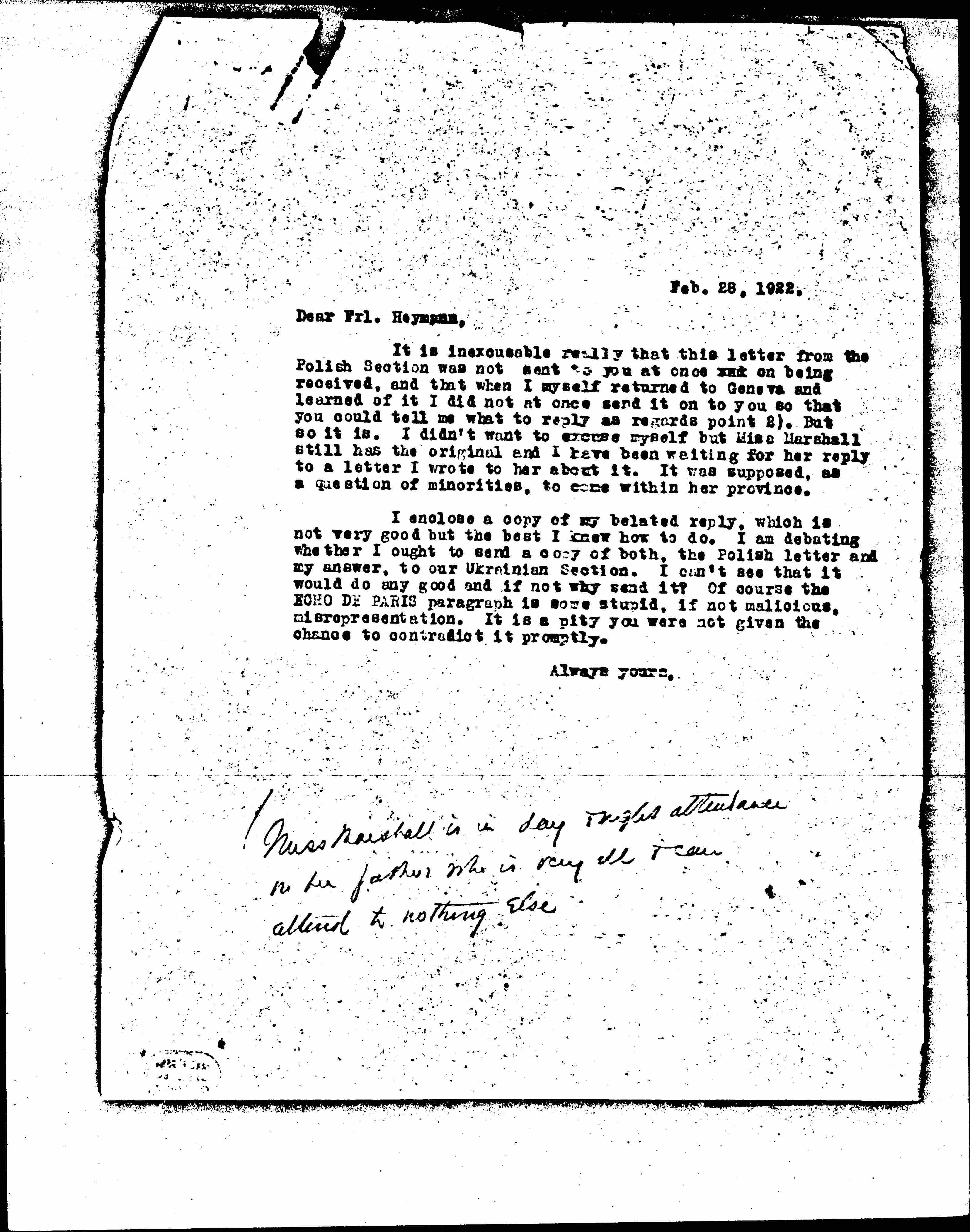 It is inexcusable really that this letter from the Polish Section was not sent to you at once [illegible] on being received, and that when I myself returned to Geneva and learned of it I did not at once send it on to you so that you could tell me what to reply as regards point 2). But so it is. I didn't want to excuse myself but Miss Marshall still has the original and I have been waiting for her reply to a letter I wrote to her about it. It was supposed, as a question of minorities, to come within her province.