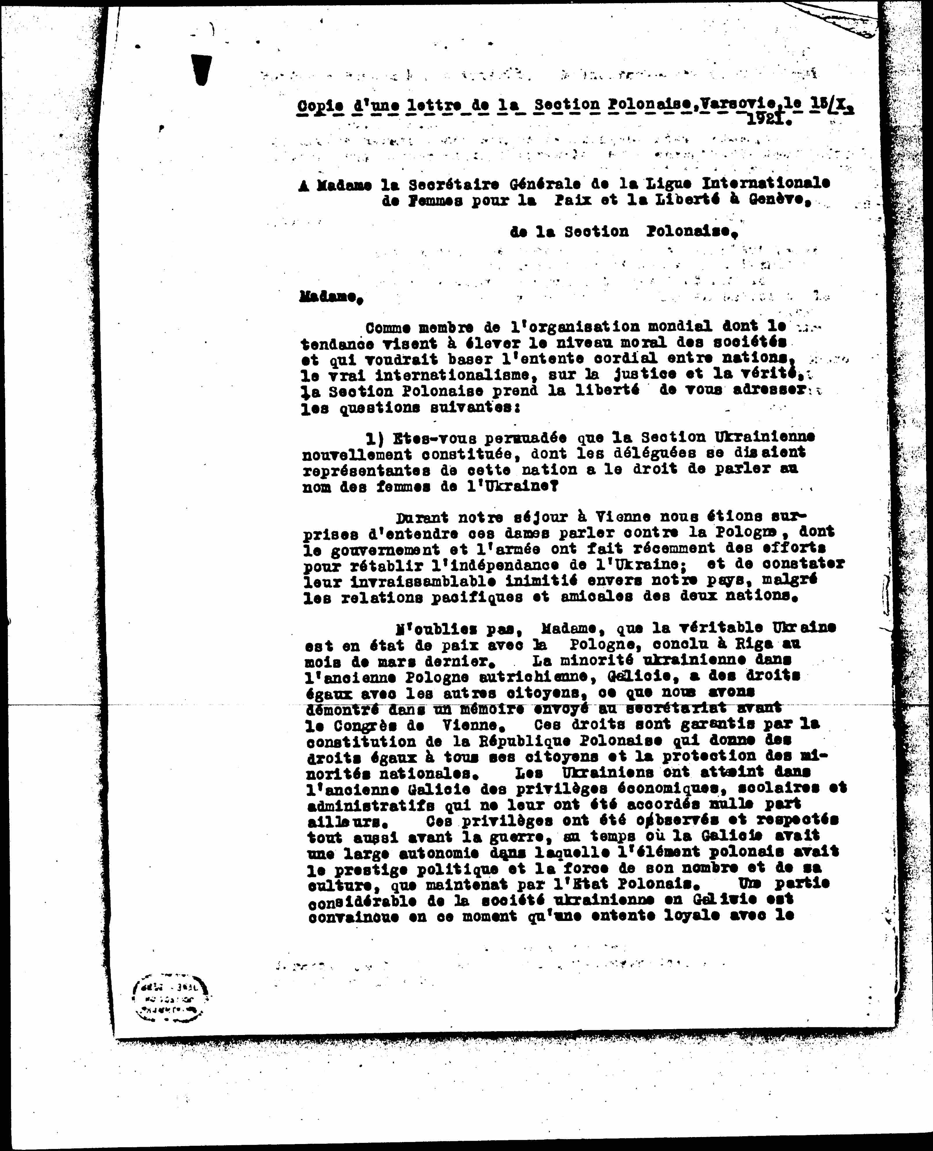 To Madam Secretary General of the International Women's League for Peace and Freedom in Geneva, of the Polish Section,