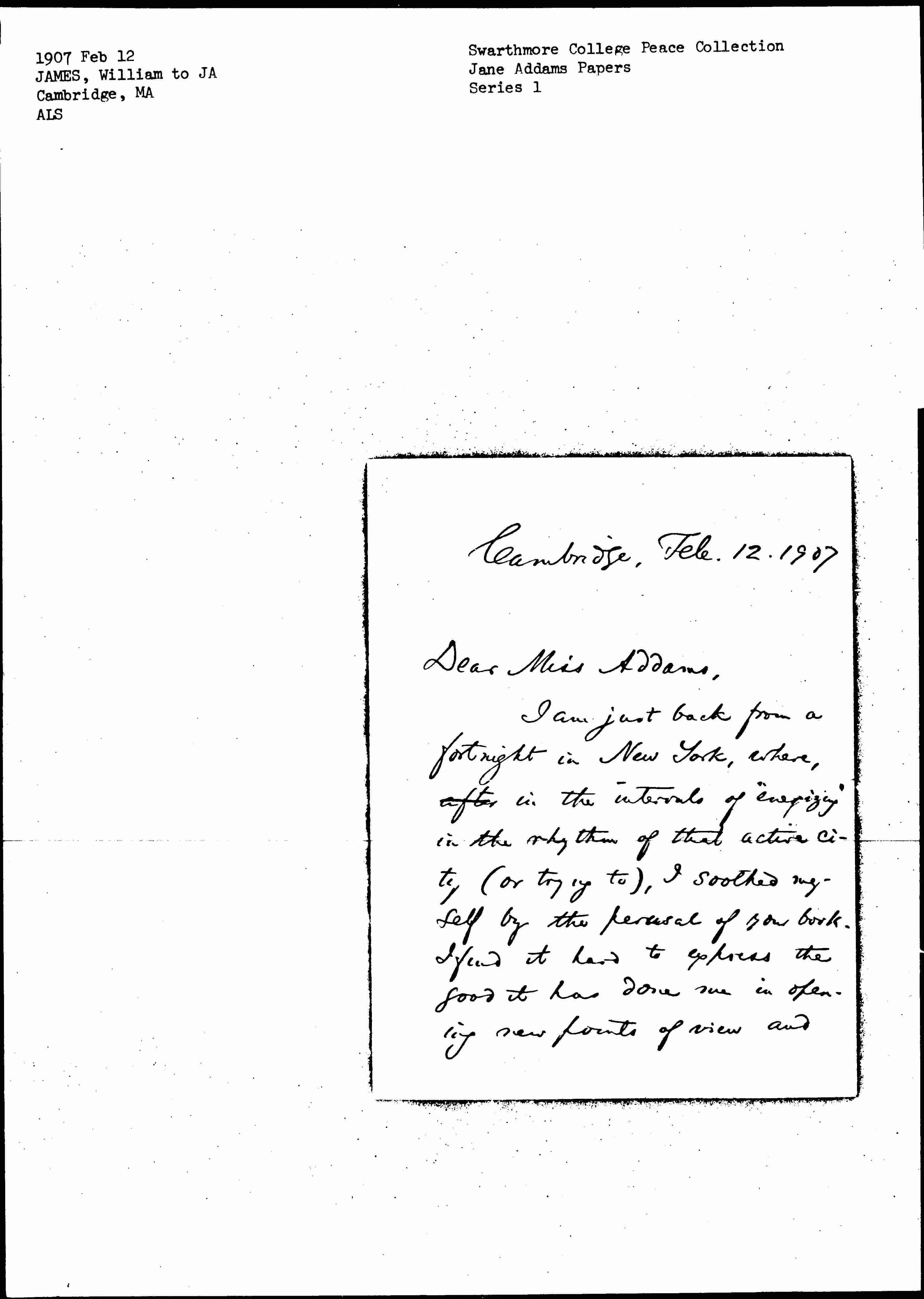 I am just back from a fortnight in New York, where, after in the intervals of "energizing" in the rhythm of that active city (or trying to), I soothed myself by the perusal of your book. I find it hard to express the good it has done me in opening new points of view and [page 2] annihilating old ones. New perspectives of hope! I don't care about this detail or that -- it is the new setting of questions. Yours is a deeply original mind, and all so quiet and harmless! yet revolutionary in the extreme, and I should suspect that this very work would act as a ferment [through] long years to come. I read precious little sociological literature, and [page 3] my opinions in that field are worth nothing -- but I am willing to bet on you.