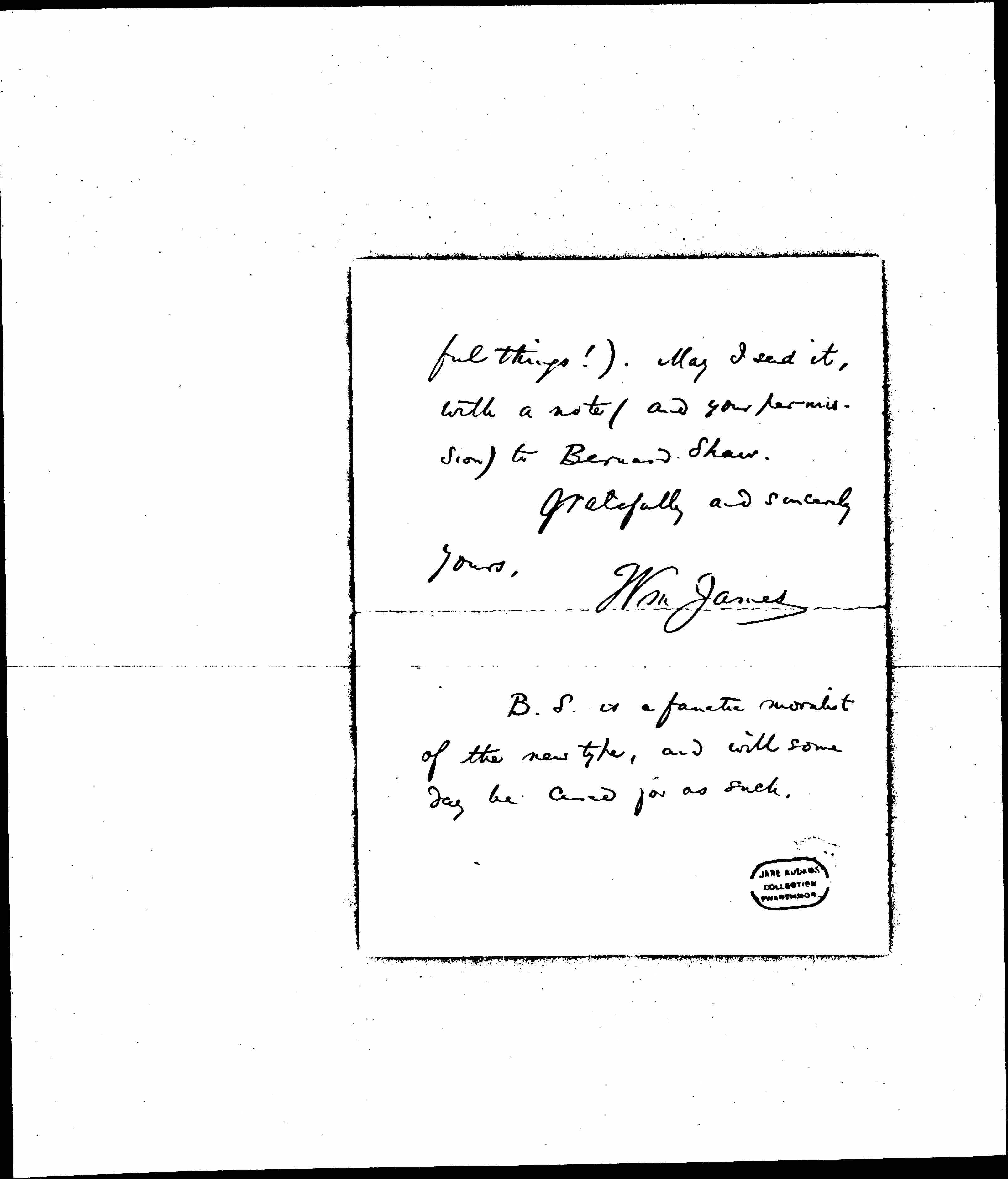 Of course you have sent it to Wells, and to Carpenter. Possibly to Chesterton; but I doubt whether it has occurred to you to order it sent to Bernard Shaw. I bet (again) that it will stimulate his genius in the most extraordinary way. The publishers have sent me a second copy (wasteful [page 4] things!). May I send it, with a note (and your permission) to Bernard Shaw.