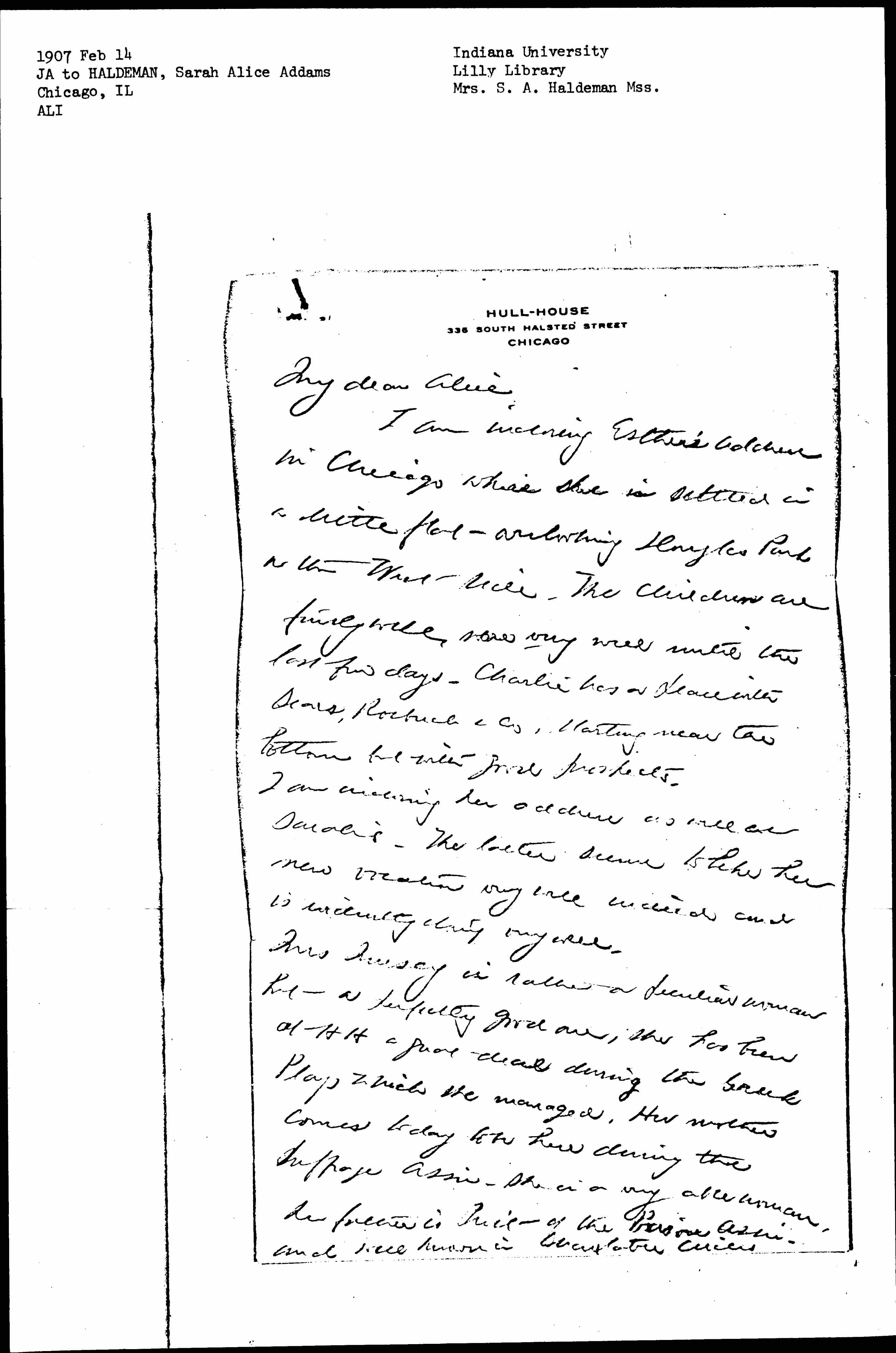I am [enclosing] Esther's address in Chicago where she is settled in a little flat overlooking Douglas Park on the West side. The children are fairly well, were very well until the last few days. Charlie has a place with Sears, Roebuck & co, starting near the bottom but with good prospects.