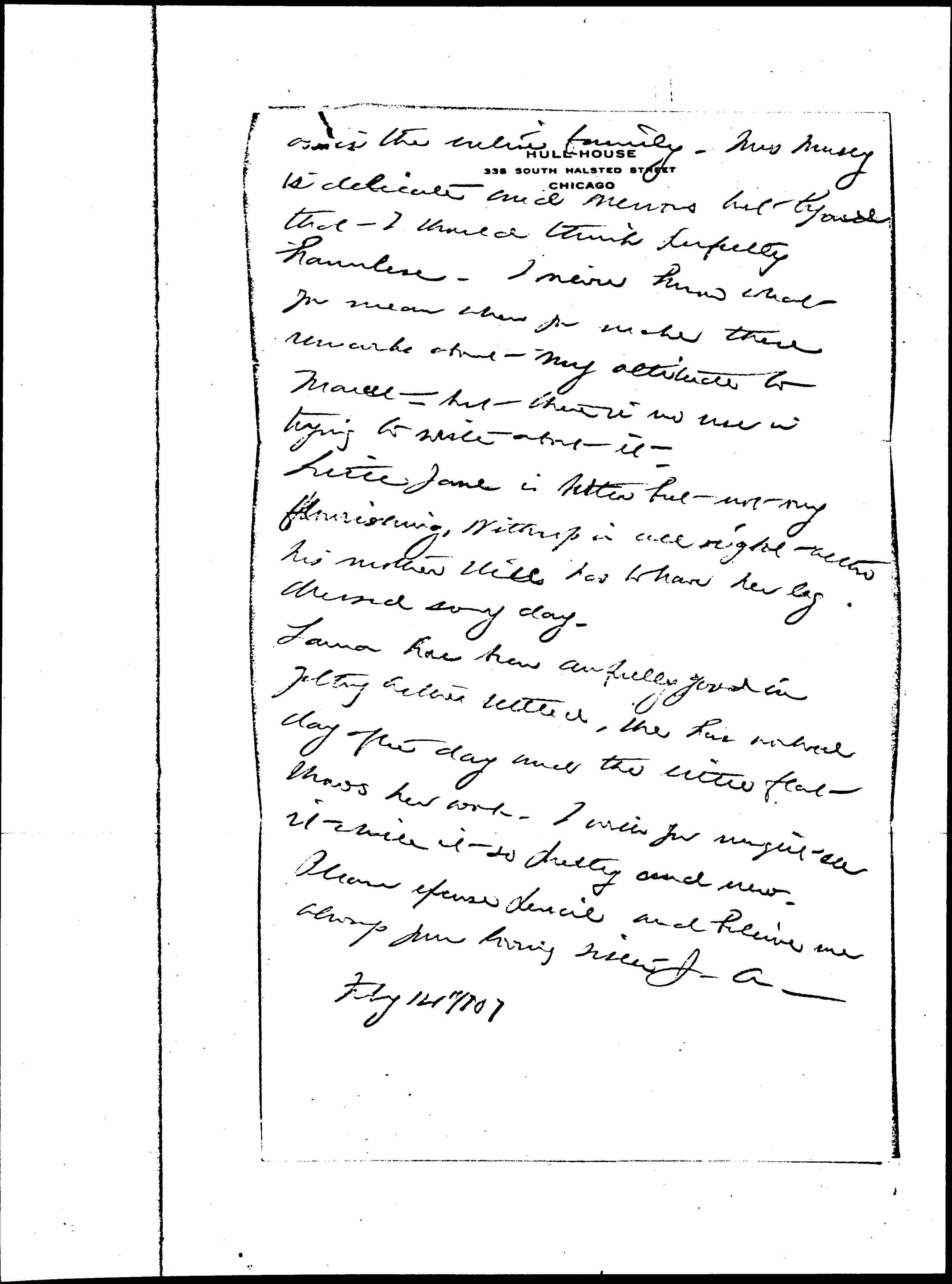 Mrs [Mussey] is rather a peculiar woman but a perfectly good one, she has been at HH a great deal during the Greek Plays which she managed. Her mother comes today to be here during the suffrage Ass'n. She is a very able woman, her father is Pres't of the Prison Ass'n, and were known in charitable circles [page 2] as is the entire family. Mrs [Mussey] is delicate and nervous but beyond that I should think perfectly harmless. I never know what you mean when you make these remarks about my attitude to Marcet — but there is no use in trying to write about it.