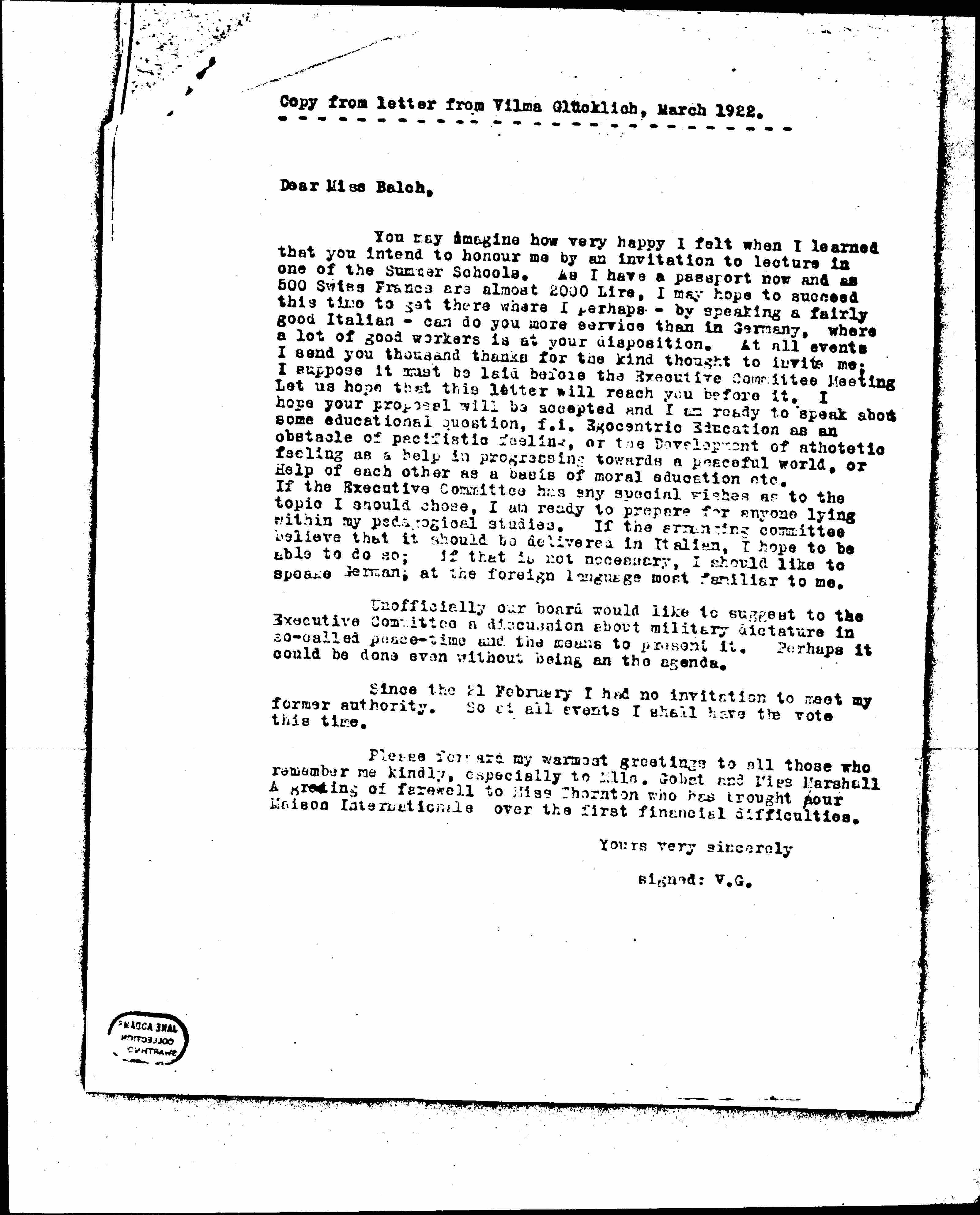You may imagine how very happy I felt when I learned that you intend to [honor] me by an invitation to lecture in one of the Summer Schools. As I have a passport now and as 500 Swiss Frances are almost 2000 Lire, I may hope to succeed this time to get there where I perhaps -- by speaking a fairly good Italian -- can do you more service than in Germany, where a lot of good workers is at your disposition. At all events I send you thousand thanks for the kind thought to invite me; I suppose it must be laid before the Executive Committee Meeting. Let us hope that this letter will reach you before it. I hope your proposal will be accepted and I am ready to speak [about] some educational question, f.i. Egocentric Education as an obstacle of pacifistic feeling, or the Development of [athletic?] feeling as a help in progressing towards a peaceful world, or Help of each other as a basis of moral education etc.