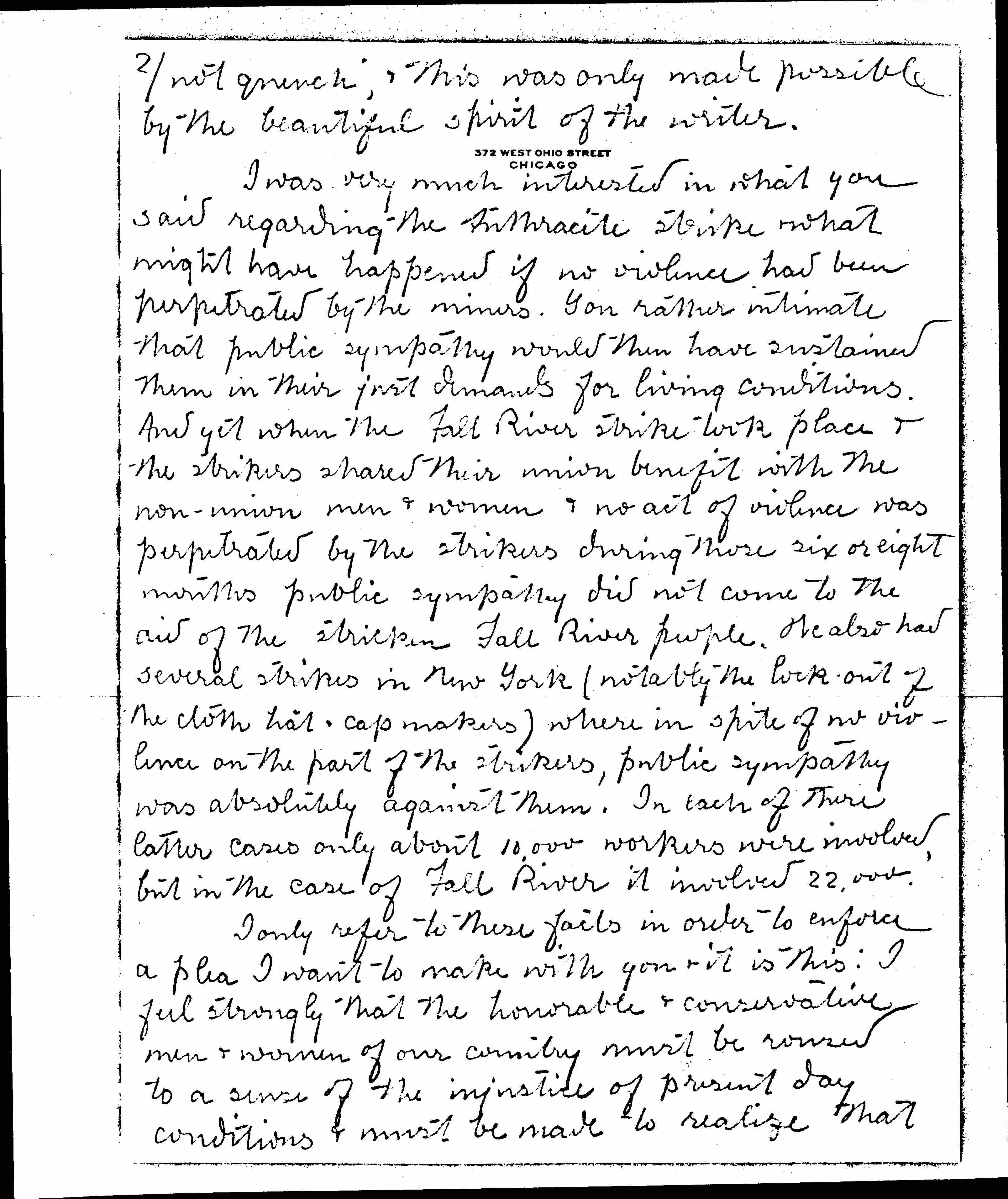 I was very much interested in what you said regarding the Anthracite strike & what might have happened if no violence had been perpetuated by the miners. You rather intimate that public sympathy would then have sustained them in their just demands for living conditions. And yet when the Fall River strike took place & the strikers shared their miner benefit with the non-miner men & women & no act of violence was perpetuated by the strikers during those six or eight months public sympathy did not come to the aid of the striken Fall River people. We also had several strikers in New York (notably the lock out for the cloth hat & cap makers) where in spite of no violence on the part of the strikers, public sympathy was absolutely against them. In each of these latter cases only about 10,000 workers were involved but in the case of Fall River it involved 22,000.