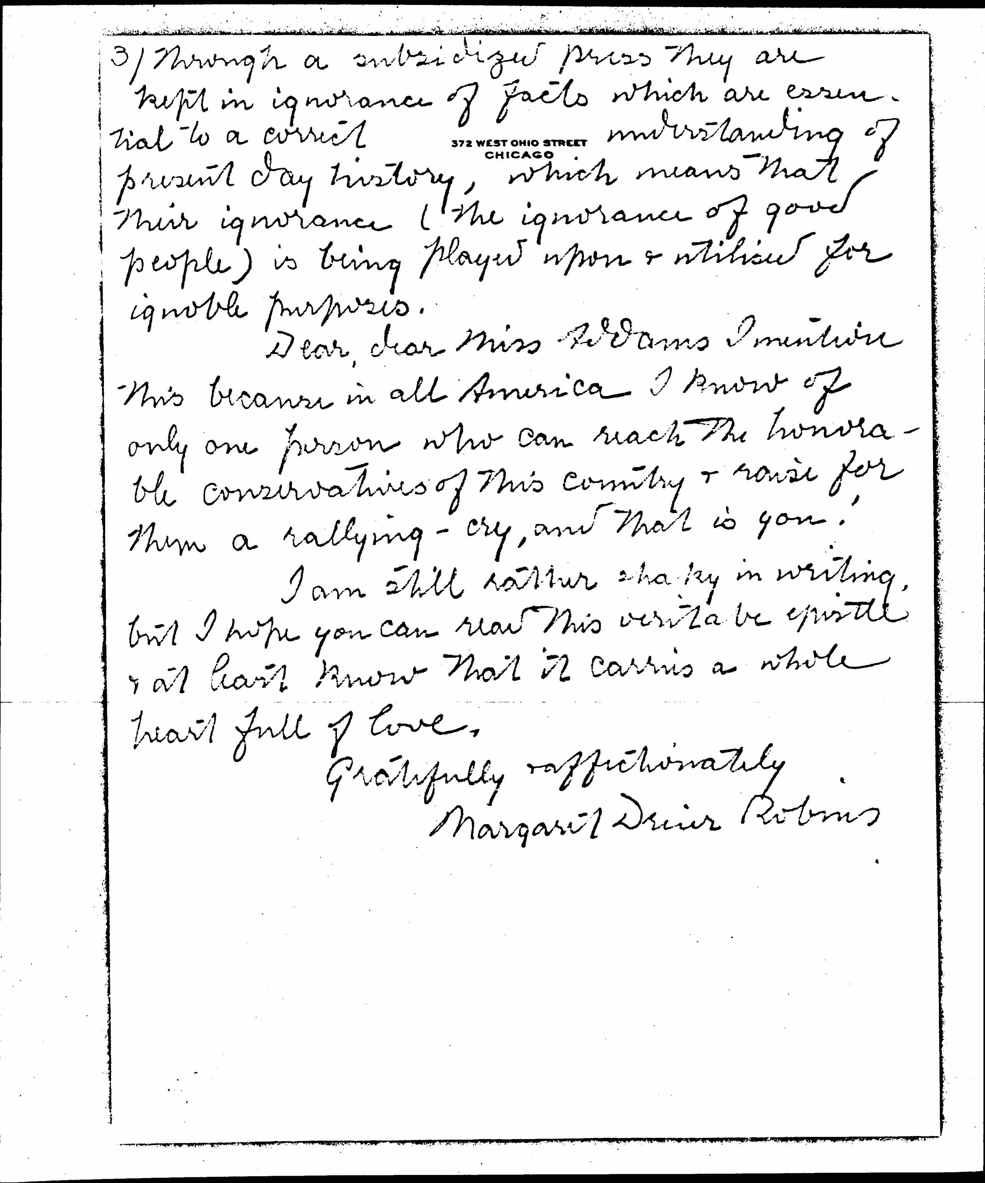 Dear, dear Miss Addams I mention this because in all America I know of only one person who can reach the honorable conservatives of this country & raise for them a rallying-cry, and that is you!