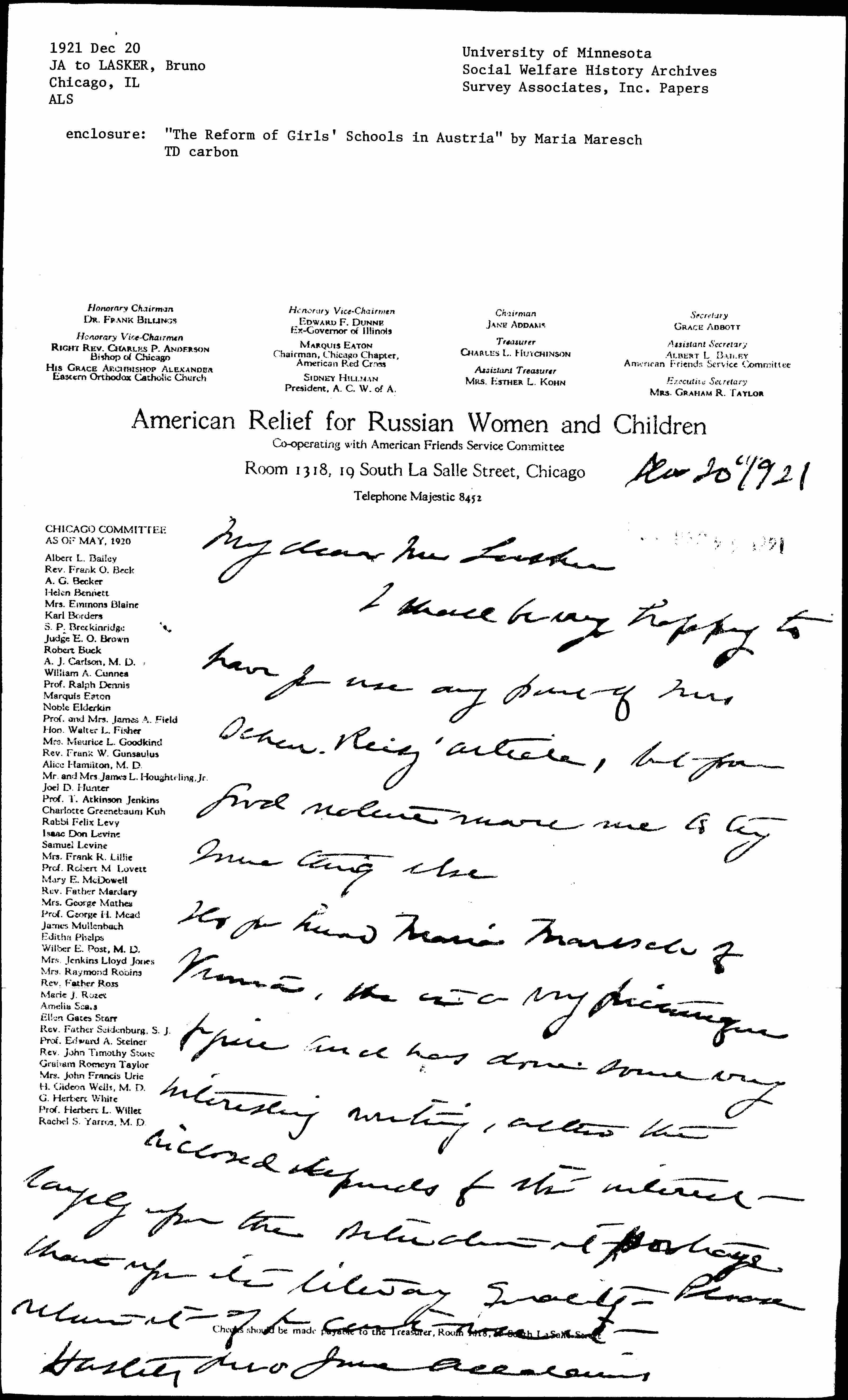 Do you know Maria Maresch of Vienna, she is a very picturesque figure and has done some very interesting writing, [although] the [enclosed] depends for its interest largely upon the situation it portrays than upon its literary gravity. Please return it if you can't use it.
