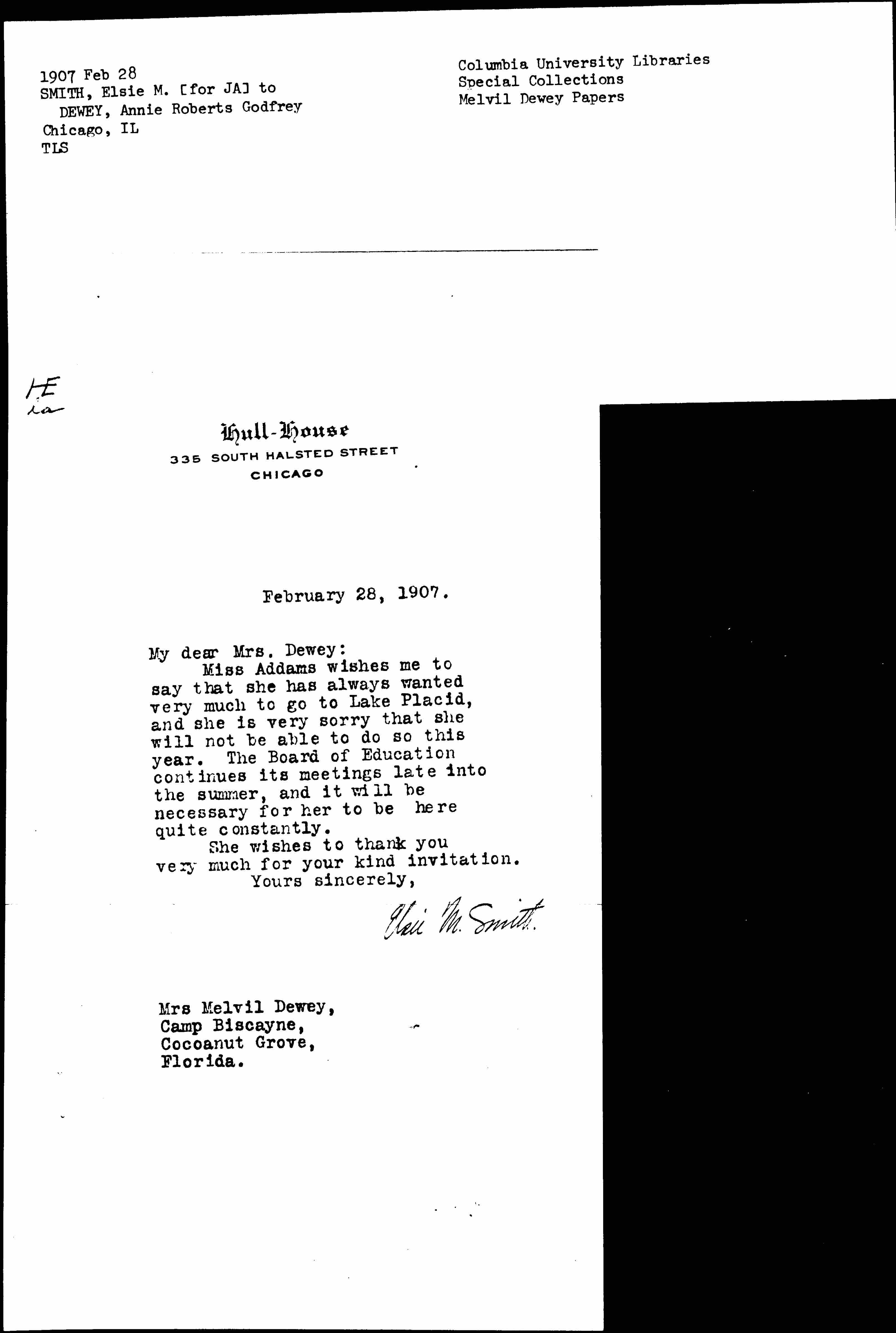 Miss Addams wishes me to say that she has always wanted very much to go to Lake Placid, and she is very sorry that she will not be able to do so this year. The Board of Education continues its meetings late into the summer, and it will be necessary for her to be here quite constantly.