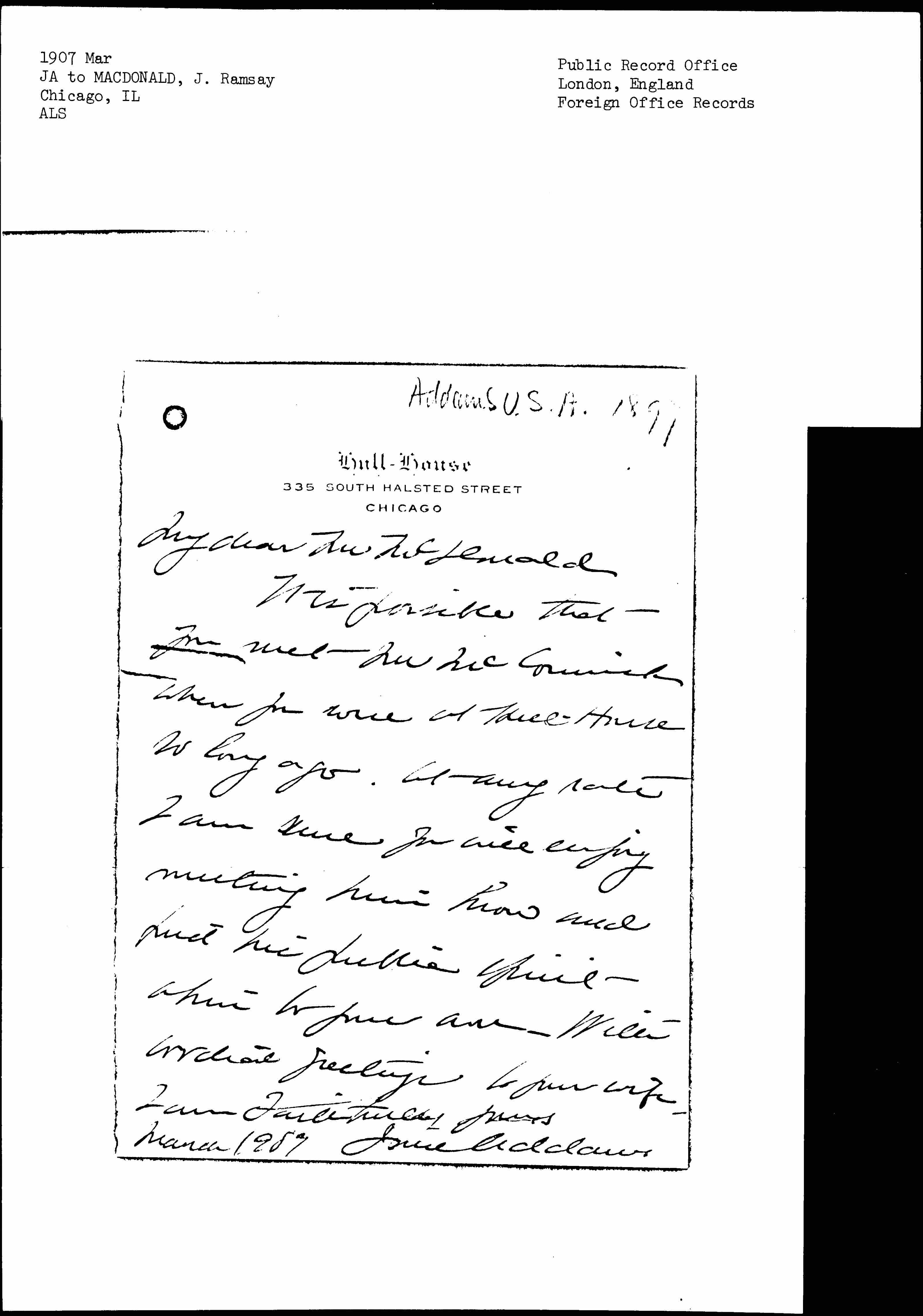 It is possible that you met Mr McCormick when you were at Hull-House so long ago. At any rate I am sure you will enjoy meeting him here and find his public spirit akin to your own. With cordial greetings to your wife,