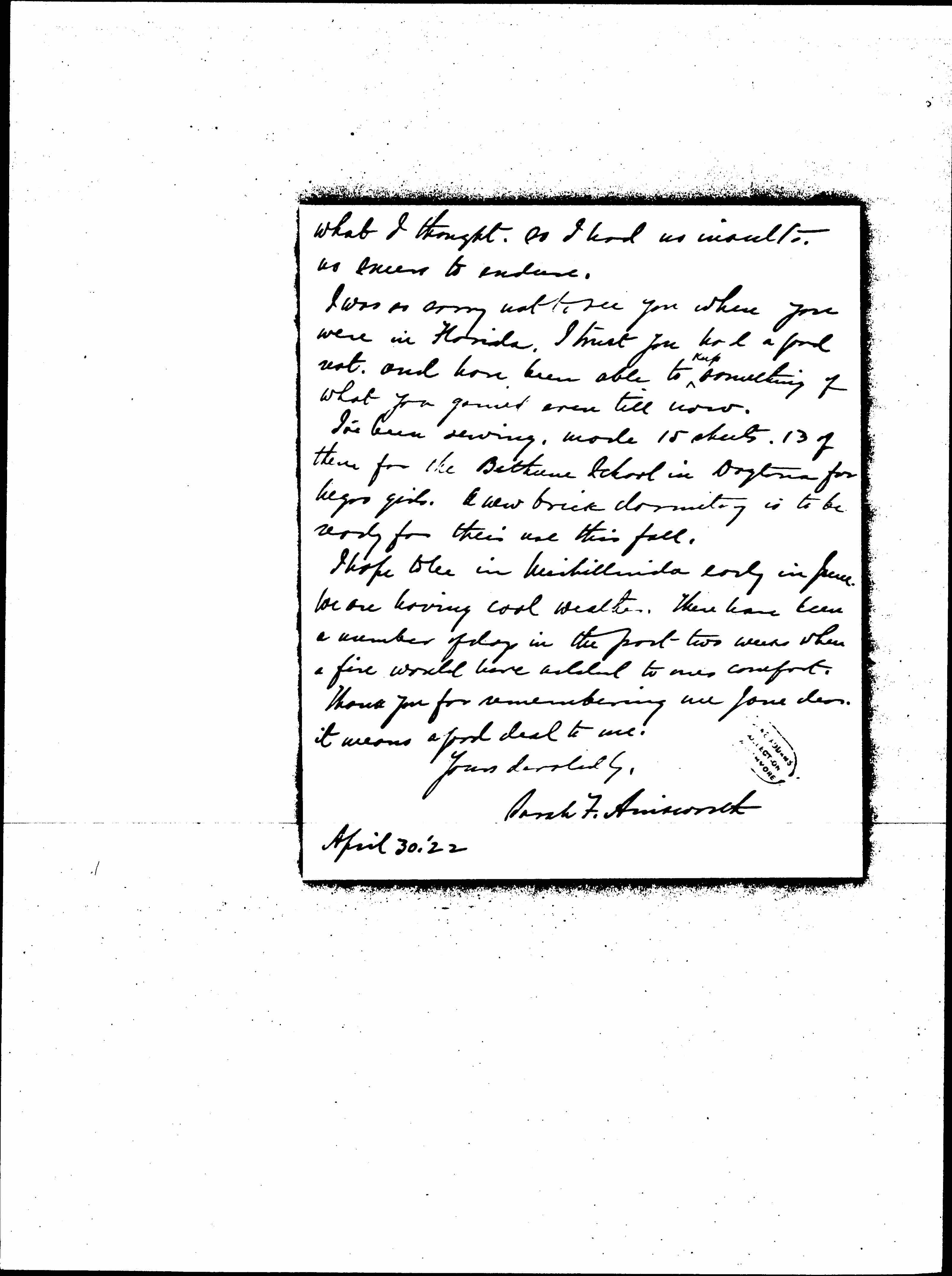 I've been sewing, made 15 sheets, 13 of them for the Bethune School in Daytona for [negro] girls. A new brick dormitory is to be ready for their use this fall.