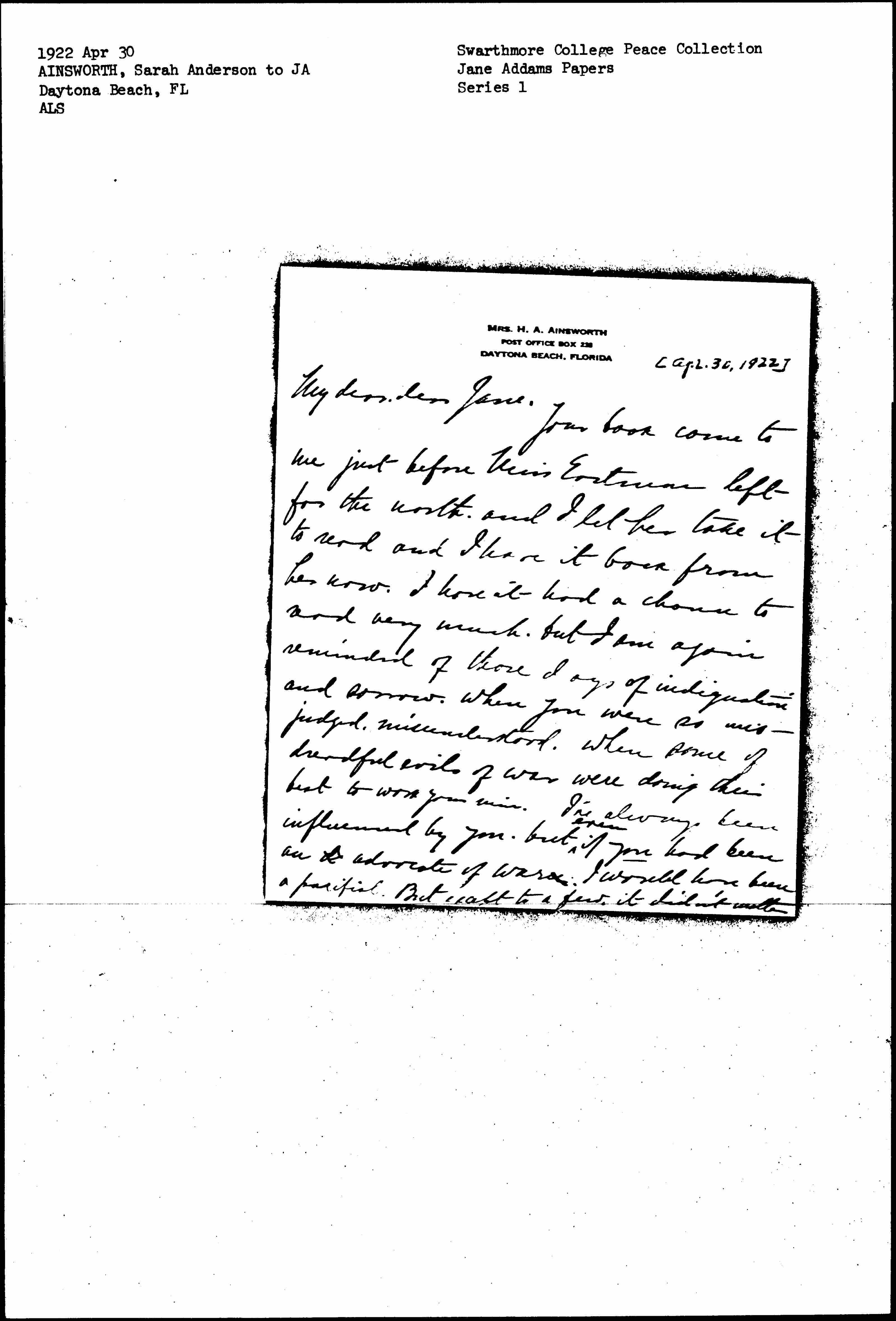 Your book came to me just before Miss Eastman left for the north and I let her take it to read and I have it back from her now. I haven't had a chance to read very much but I am again reminded of those days of indignation and sorrow when you were so misjudged, misunderstood, when some of dreadful evils of war were doing their best to [work your ruin]. I've always been influenced by you, but ↑even↓ if you had been an d advocate of wars, I would have been a pacifist. But if all to a few, it didn't matter [page 2] what I thought, so I had [no] insults as [success] to [endure].