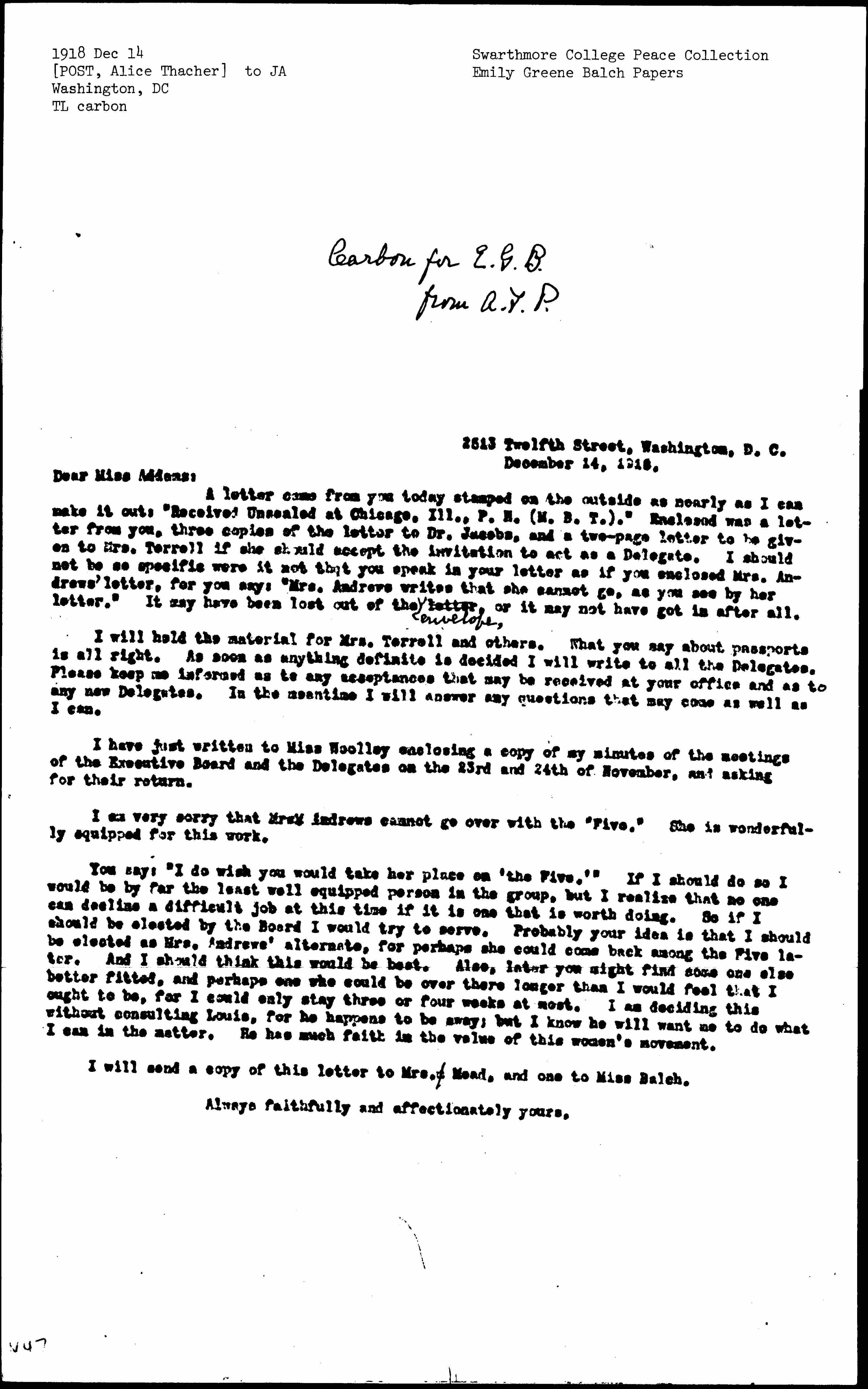You say: "I do wish you would take her place on 'the Five.'" If I should do so I would be by far the least well equipped person in the group, but I realize that no one can decline a difficult job at this time if it is one that is worth doing. So if I should be elected by the Board I would try to serve. Probably your idea is that I should be elected as Mrs. Andrews' alternate, for perhaps she could come back among the Five later. And I should think this would be best. Also, later you might find some one else better fitted, and perhaps one who could be over there longer than I would feel that I ought to be, for I could only stay three or four weeks at most. I am deciding this without consulting Louis, for he happens to be away; but I know he will want me to do what I can in the matter. He has much faith in the value of this women's movement.