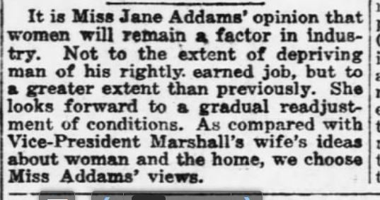 It is Miss Jane Addams' opinion that women will remain a factor in industry. Not to the extent of depriving man of his rightly earned job, but to a greater extent than previously. She looks forward to a gradual readjustment of conditions. As compared with Vice-President Marshall's wife's ideas about woman and the home, we choose Miss Addams' views.