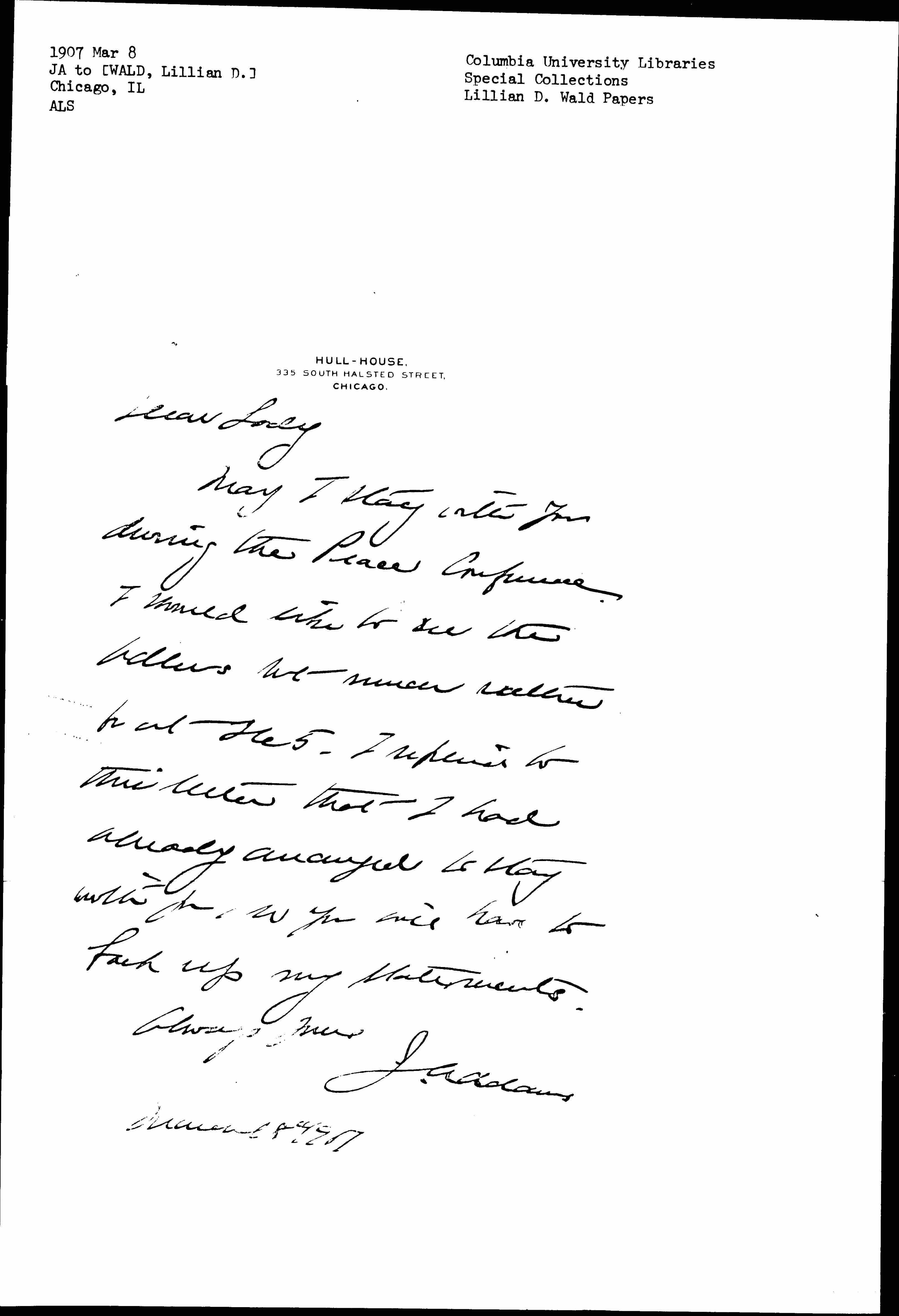 May I stay with you during the Peace Conference. I should like to see the Adlers but much rather be at 265. I replied to this letter that I had already arranged to stay with you, so you will have to back up my statements.